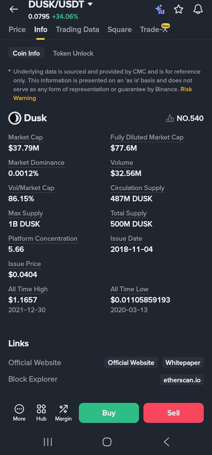 Die vom Benutzer bereitgestellten Screenshots zeigen ein lebendiges Bild von DUSKs Momentum. In der Binance-App wird DUSK/USDT bei $0.0793-$0.0796 angezeigt, was einem Anstieg von 33.73%-34.23% innerhalb von 24 Stunden entspricht. Dieser Anstieg steht im Einklang mit breiteren Markttrends, scheint aber durch projektspezifische Katalysatoren getrieben zu sein.