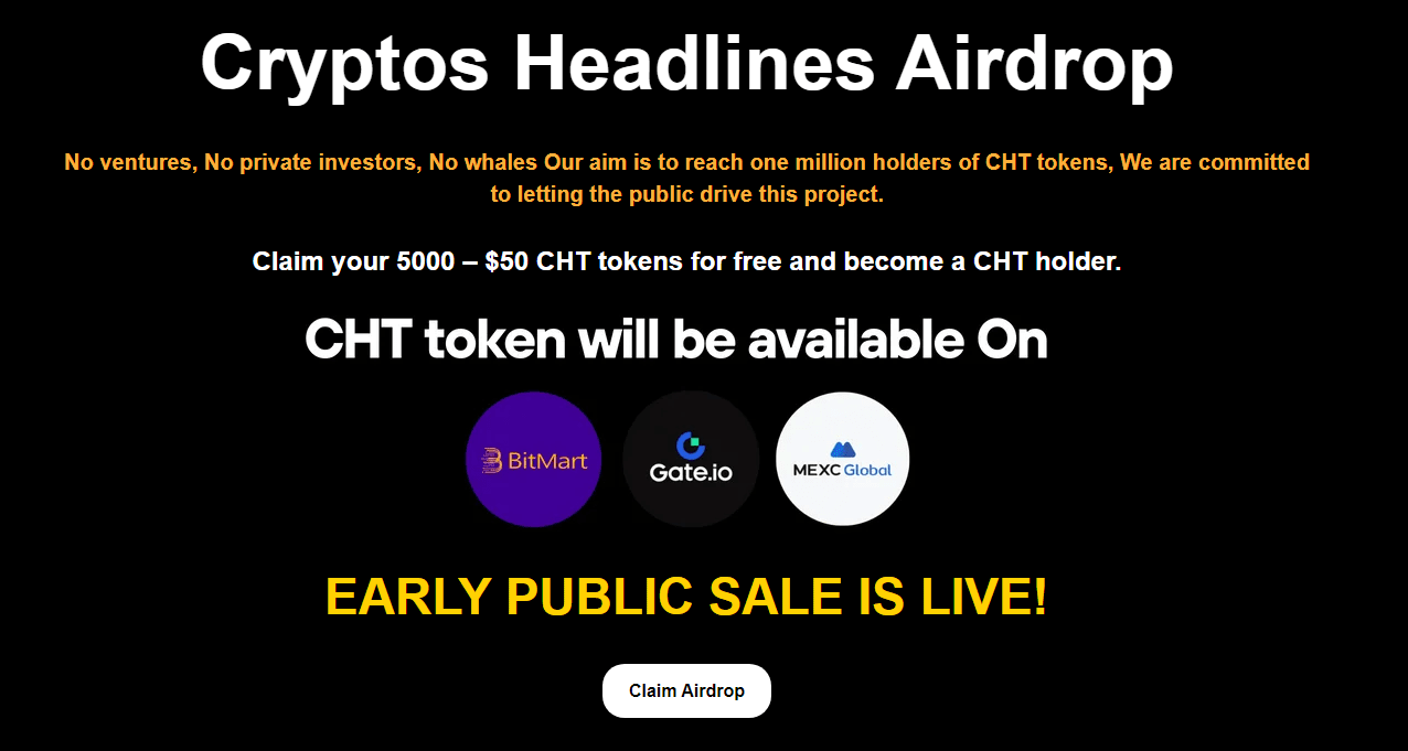 Cryptos Headlines Token Airdrop ist live, fordern Sie 5000 CHT-Token kostenlos auf CryptosHeadlinesToken.com an