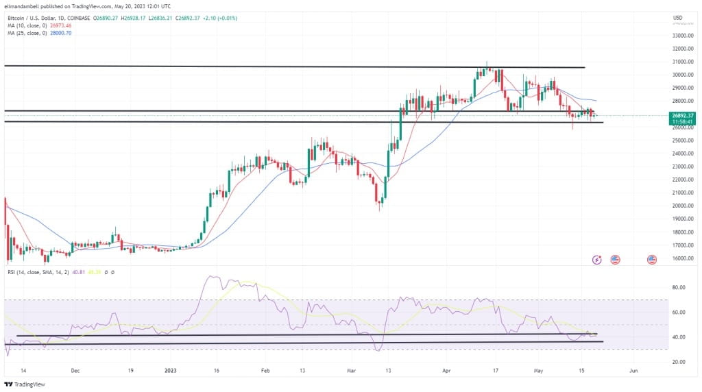 Nach einem Höchststand von 27.128,62 $ während der gestrigen Sitzung fiel BTC/USD heute auf ein Intraday-Tief von 26.700,21 $.