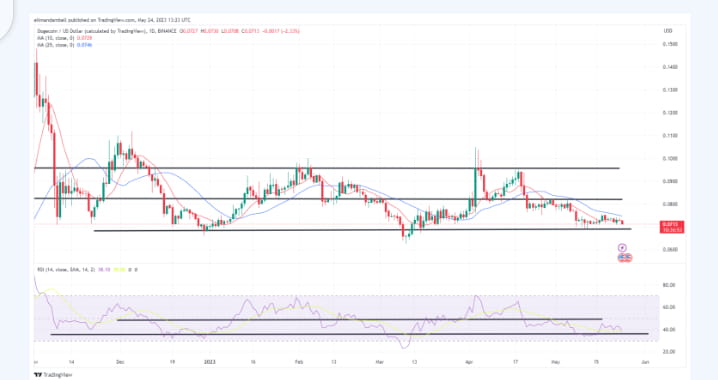 Nach einem Höchststand von 0,07305 $ am Dienstag fiel DOGE/USD in der heutigen Sitzung auf einen Tiefstand von 0,07103 $.