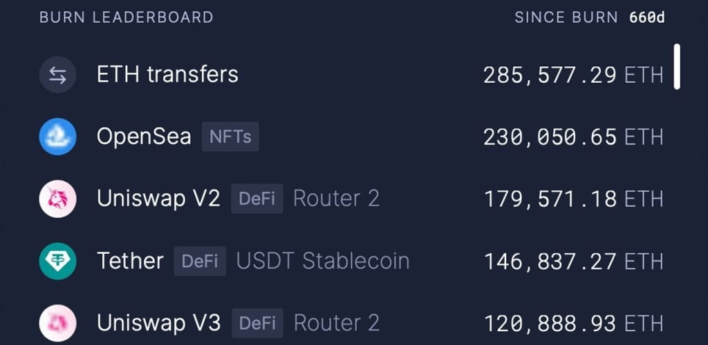Seit 2021 haben Tethers ERC20-Transaktionen beim Verbrennen von 146.837 Ether eine Rolle gespielt, während Uniswap v3-Übertragungen zum Verbrennen von 120.889 ETH beigetragen haben. Neben diesen bemerkenswerten Burnern enthält die Bestenliste aller Zeiten auch prominente Mitwirkende wie Metamask, USDC, Otherdeed und die Erstellung neuer Verträge.