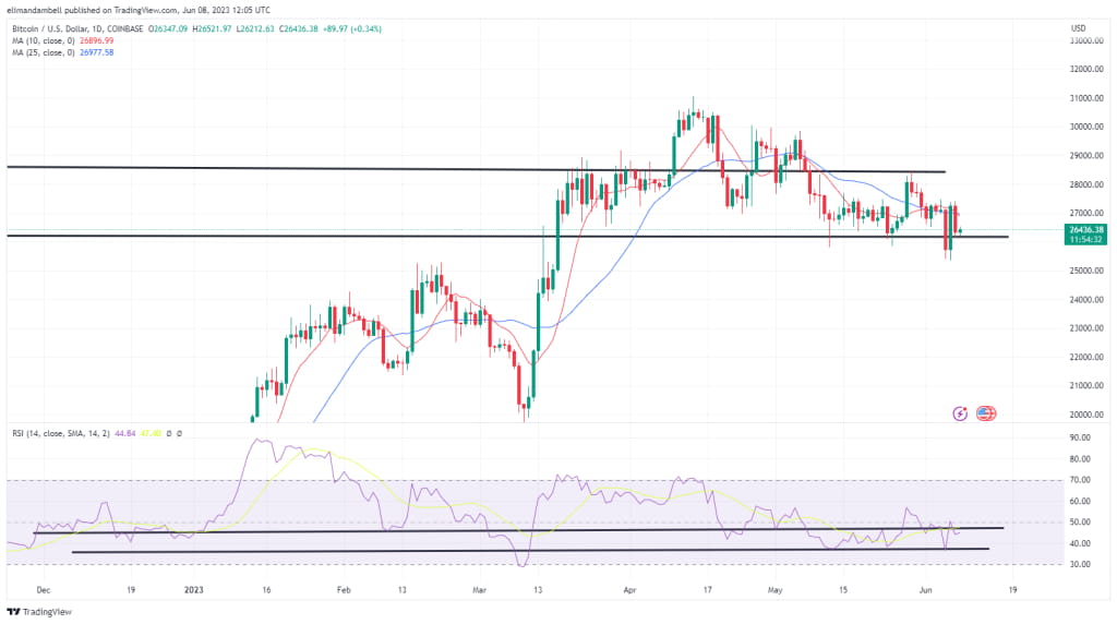 Durch die heutige Bewegung durchbrach die größte Kryptowährung der Welt kurzzeitig den wichtigen Unterstützungspunkt bei 26.300 US-Dollar.