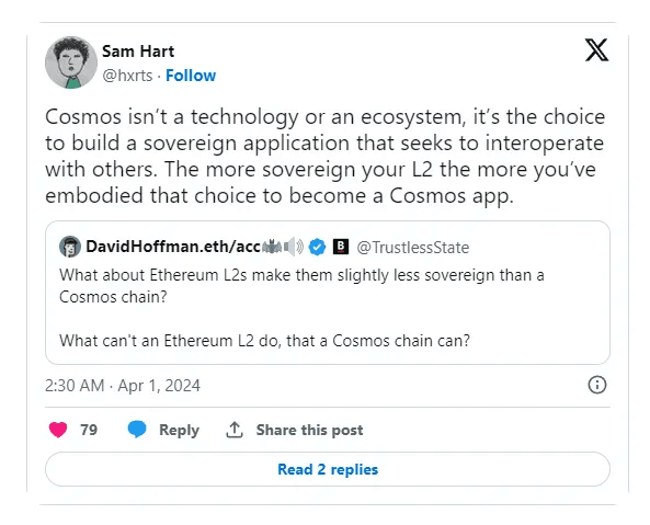 Das Cosmos-Konzept und die Ethereum Layer 2-Vision sind im Grunde dasselbe. Es handelt sich um eine horizontale Landschaft bestehend aus unabhängigen, souveränen Ketten, die das Recht haben, ihr eigenes Schicksal zu bestimmen.