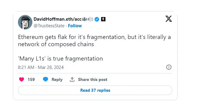 Ethereum wurde wegen seiner „Spaltung“ kritisiert, was eine Farce ist, weil es das Gegenteil der Realität ist: Ethereum ist das einzige Netzwerk, das über kryptografisch erprobte Netzwerke verfügt, die andere Staatsketten miteinander verbinden. Im Gegensatz dazu sind viele Layer-1-Bereiche vollständig und vollständig fragmentiert, während der Layer-2-Bereich von Ethereum nur von Verzögerungen betroffen ist.