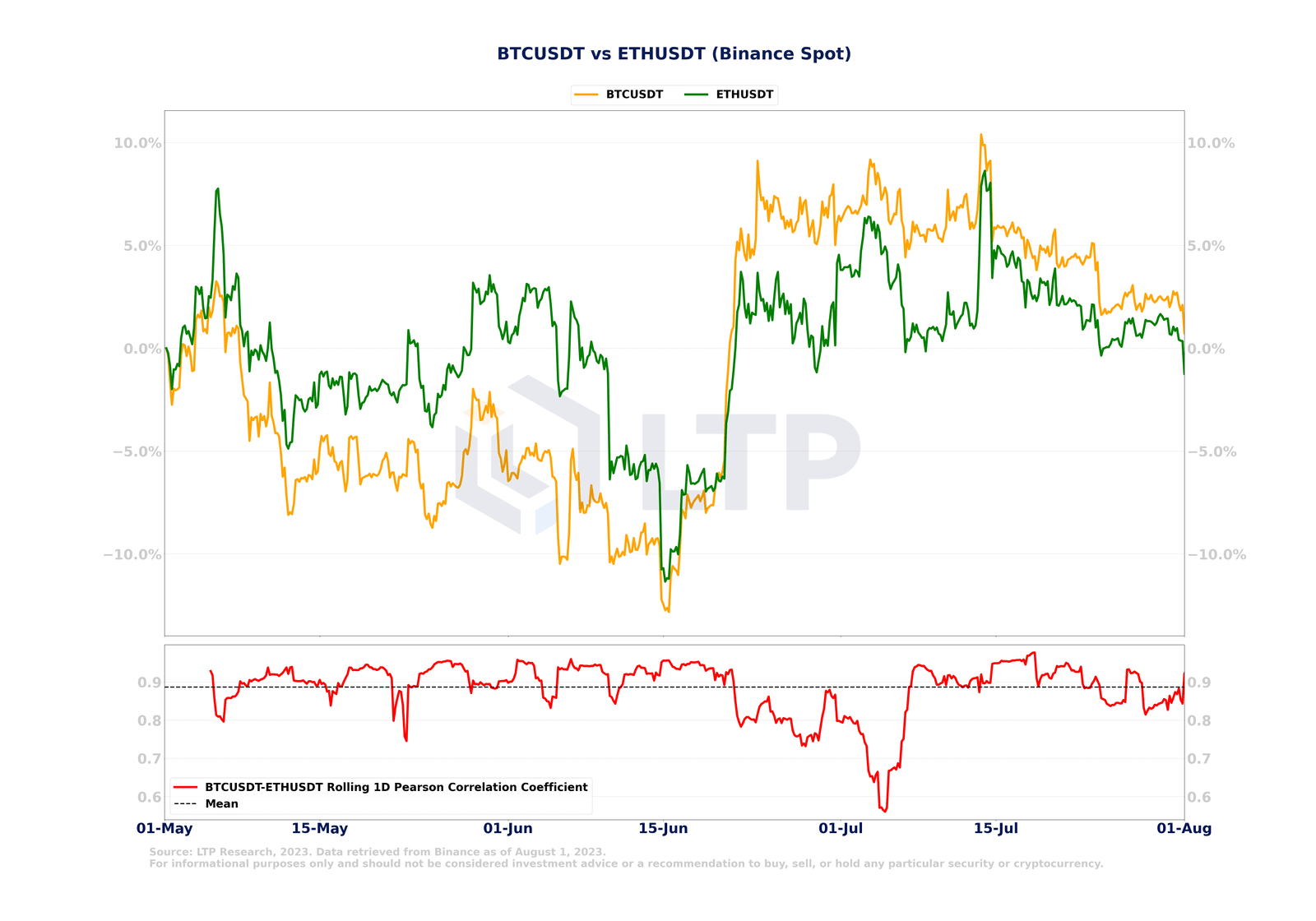 Quelle: LTP Research, 2023. Daten abgerufen von Binance, Stand: 1. August 2023. Nur zu Informationszwecken und sollte nicht als Anlageberatung oder Empfehlung zum Kauf, Verkauf oder Halten bestimmter Wertpapiere oder Kryptowährungen betrachtet werden.Diese Korrelation, die durch einen Pearson-Korrelationskoeffizienten von 0,9 quantifiziert wird, unterstreicht die konsistenten parallelen Bewegungen dieser bekannten Kryptowährungen auf täglicher Basis. Dennoch ist es bemerkenswert, dass Anfang Juli eine vorübergehende Abweichung in der Korrelation auftrat, die in erster Linie darauf zurückzuführen ist, dass es Ethereum nicht gelang, die Renditen von Bitcoin zu reproduzieren. Diese Divergenz kann auf die vorherrschenden bullischen Marktkatalysatoren zurückgeführt werden, die überwiegend Bitcoin gegenüber Ethereum bevorzugten.