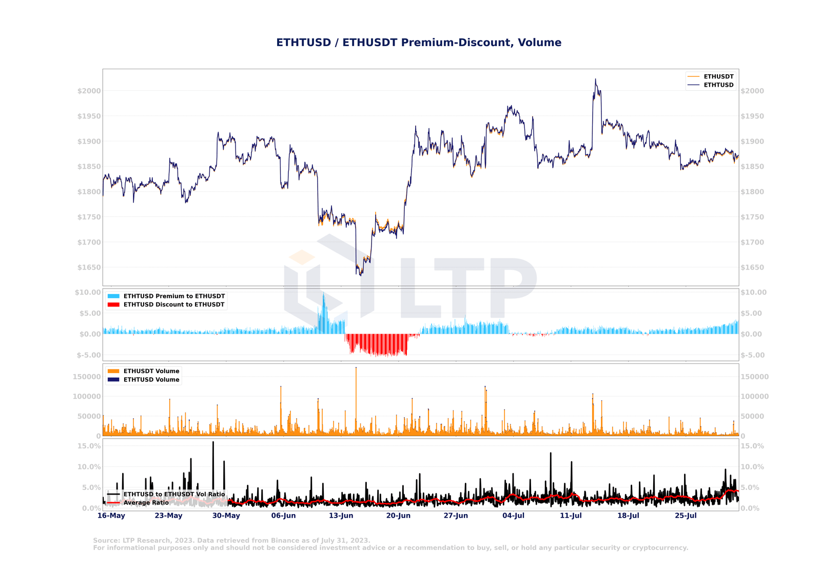 Quelle: LTP Research, 2023. Daten abgerufen von Binance, Stand: 1. August 2023. Nur zu Informationszwecken und sollte nicht als Anlageberatung oder Empfehlung zum Kauf, Verkauf oder Halten bestimmter Wertpapiere oder Kryptowährungen betrachtet werden.Der Preis von Ethereum (ETH) für das Paar ETHTUSD wurde weiterhin mit einem Aufschlag gegenüber dem Paar ETHUSDT gehandelt. Das Handelsvolumen von ETHTUSD machte jedoch mit weniger als 5 % einen deutlich geringeren Prozentsatz des gesamten Handelsvolumens von ETHUSDT aus, da es für das Paar ETHTUSD keine Null-Gebühren-Aktion gibt. Dies steht im deutlichen Kontrast zum Handelsvolumen von BTCTUSD gegenüber BTCUSDT, das ein viel höheres Aktivitätsniveau aufwies.