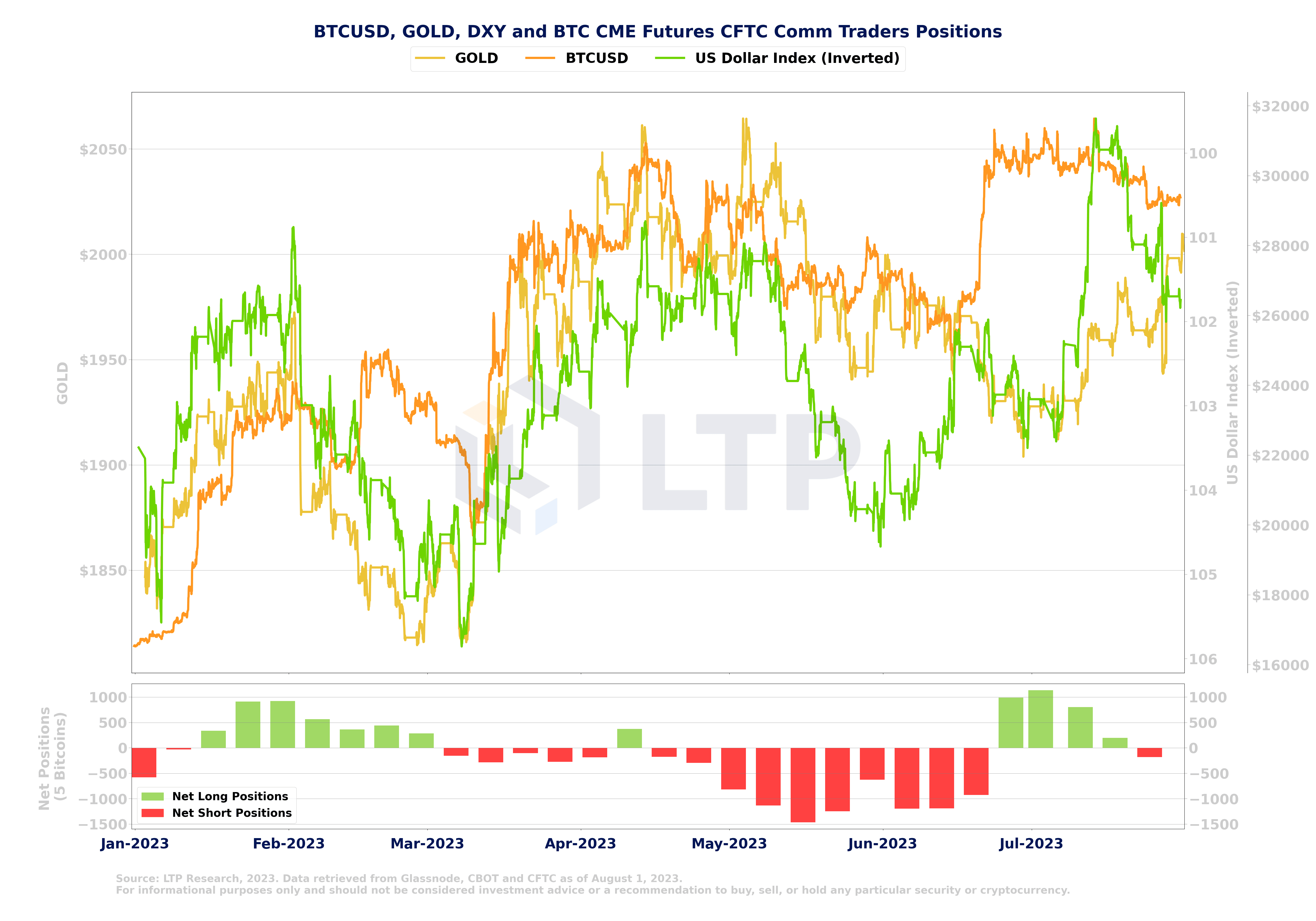 Quelle: LTP Research, 2023. Daten abgerufen von Glassnode, CBOT & CFTC, Stand: 1. August 2023.