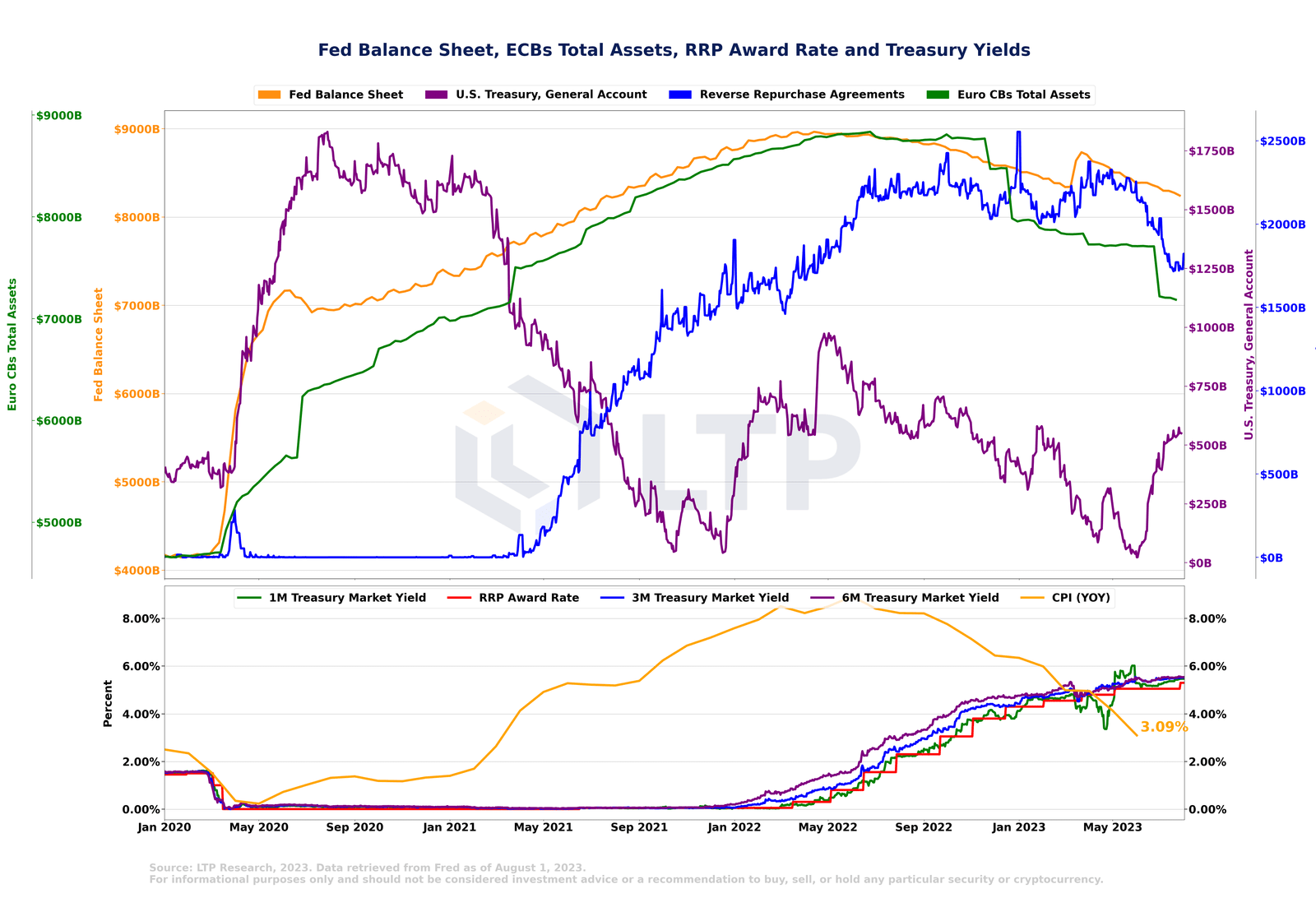 Abb. A. Bilanz der Fed, Allgemeines Konto des US-Finanzministeriums (TGA), Reverse-Repurchase-Agreements (RRP) und Gesamtvermögen der Euro-Zentralbanken