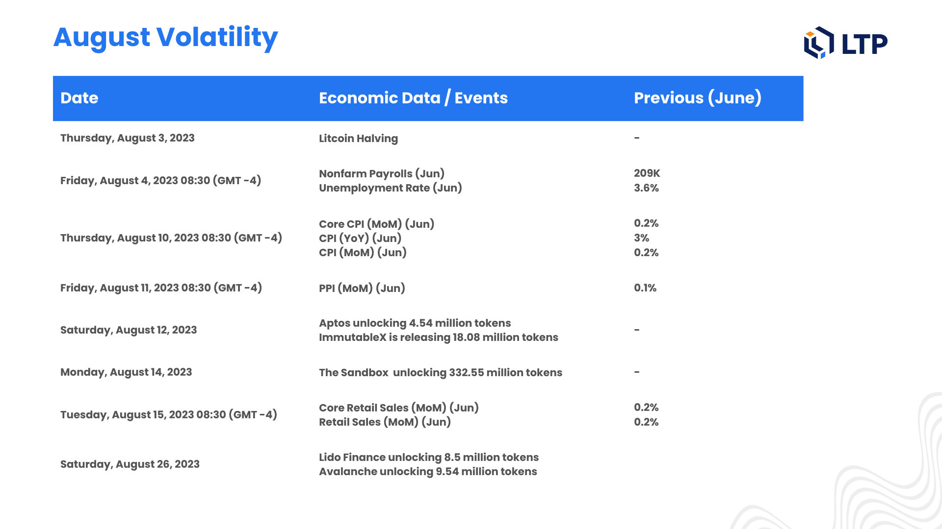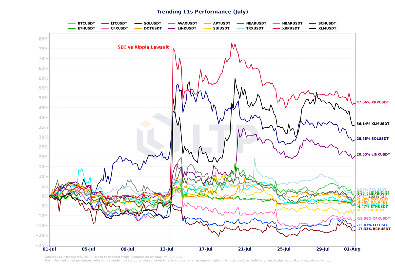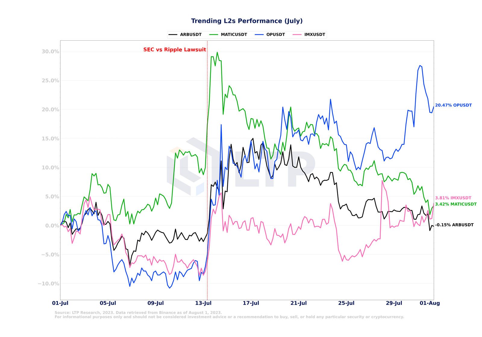 Quelle: LTP Research, 2023. Daten abgerufen von Binance, Stand: 1. August 2023. Nur zu Informationszwecken und sollte nicht als Anlageberatung oder Empfehlung zum Kauf, Verkauf oder Halten bestimmter Wertpapiere oder Kryptowährungen betrachtet werden.