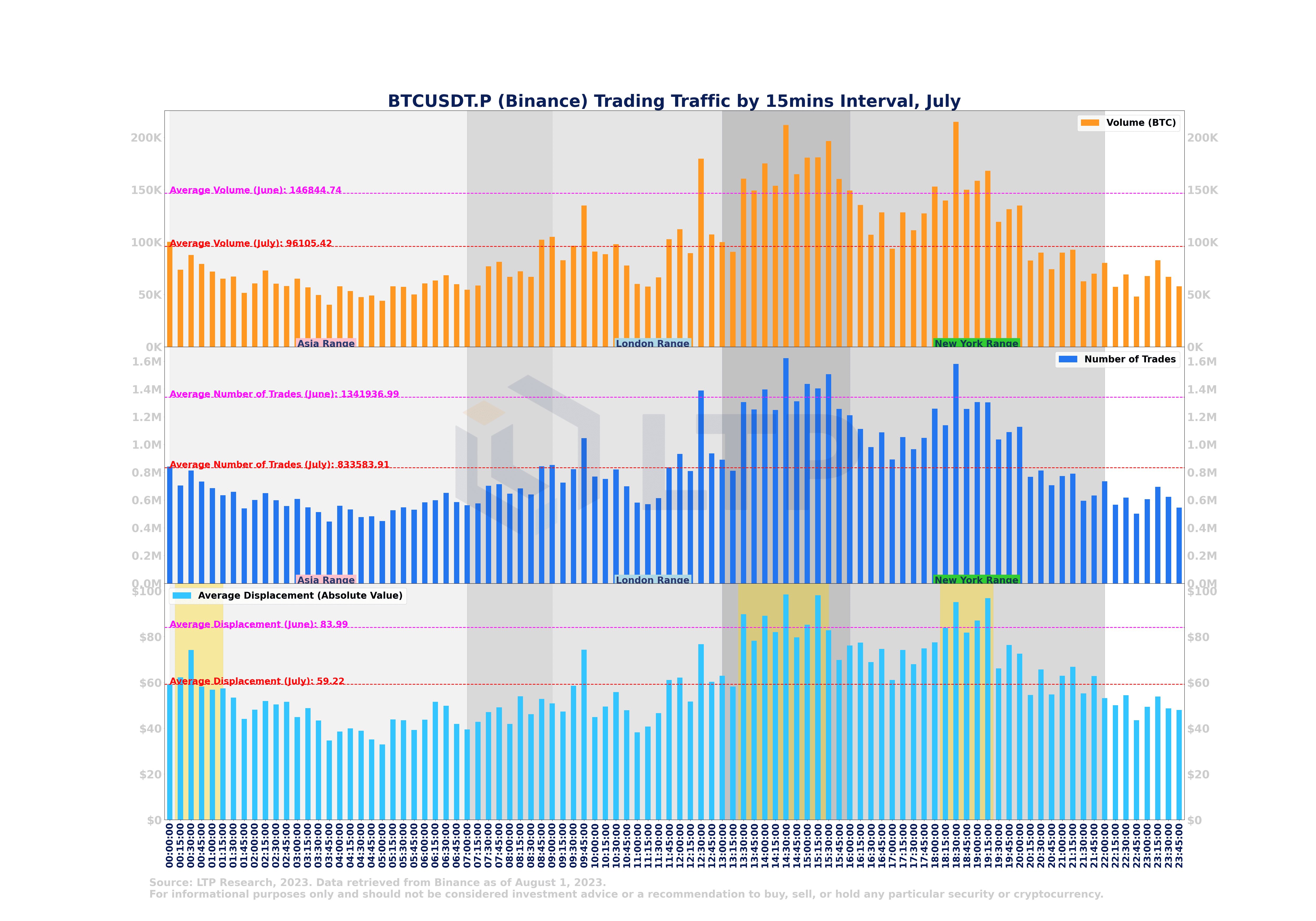 Im Juli war im Vergleich zu Juni ein Rückgang der Handelsaktivität zu verzeichnen. Das gesamte Handelsvolumen im 15-Minuten-Intervall betrug 94.523 BTC, gegenüber 146.845 BTC im Juni. Die Gesamtzahl der Trades pro 15-Minuten-Intervall ging ebenfalls zurück, von 1.341.937 im Juni auf 819.965 im Juli. Außerdem verringerte sich die durchschnittliche Verdrängung pro 15-Minuten-Intervall von 84 $ auf 60 $, was auf eine geringere Volatilität hindeutet.
