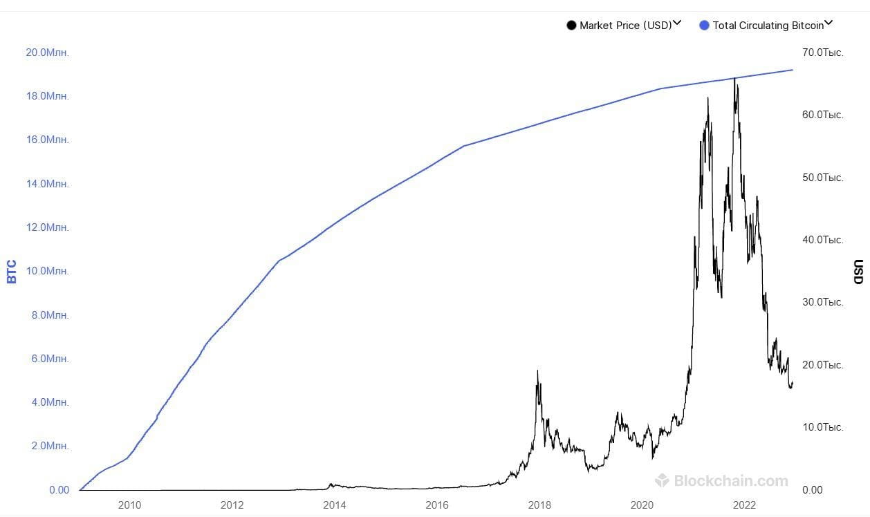 Die Bitcoin-Emission ist begrenzt. Insgesamt werden 21 Millionen Coins geschürft. Zum Zeitpunkt der Erstellung dieser Rezension wurden bereits über 19,2 Millionen BTC abgebaut. Die Grafik zeigt, wie vor dem Hintergrund einer Verlangsamung des Zustroms neuer Münzen (blaue Kurve) die Kryptowährungsrate wächst. Hier erfahren Sie, warum das passiert: