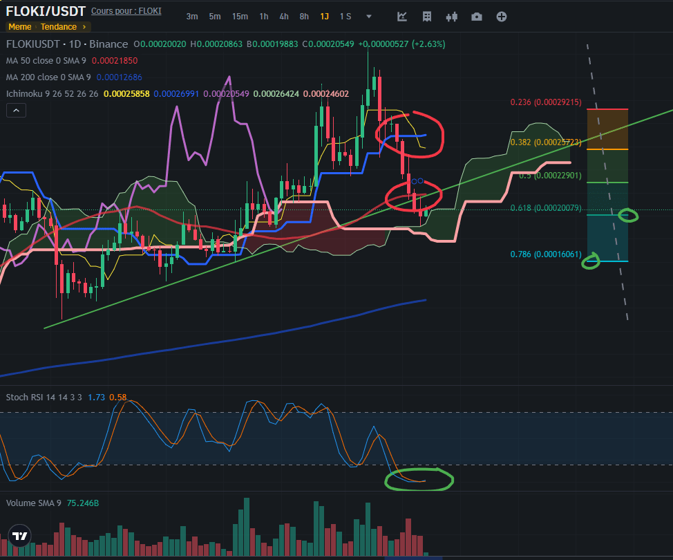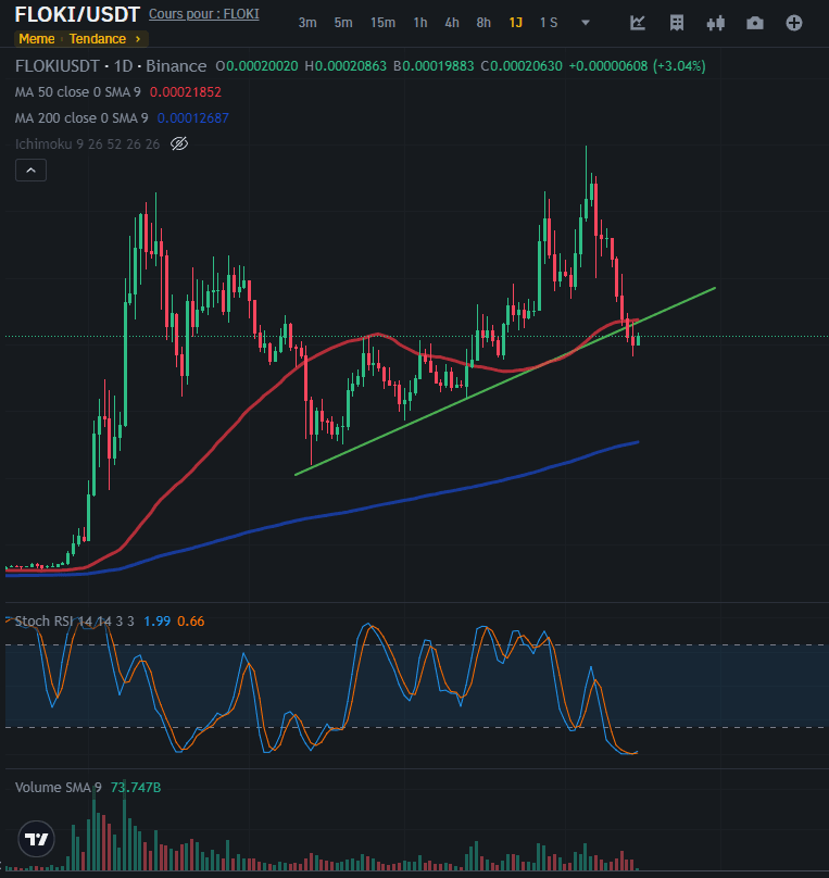 Derzeit ist der Kryptowährungsmarkt von einer gewissen Instabilität geprägt und weist auf breiter Front eine deutliche Schwäche auf. Bei Floki (FLOKI) können wir beobachten, dass es zwischen gestern und heute seine Aufwärtstrendlinie durchbrochen und gleichzeitig seinen gleitenden 50-Tage-Durchschnitt (MA50) unterschritten hat. Dies sind starke bärische Signale.