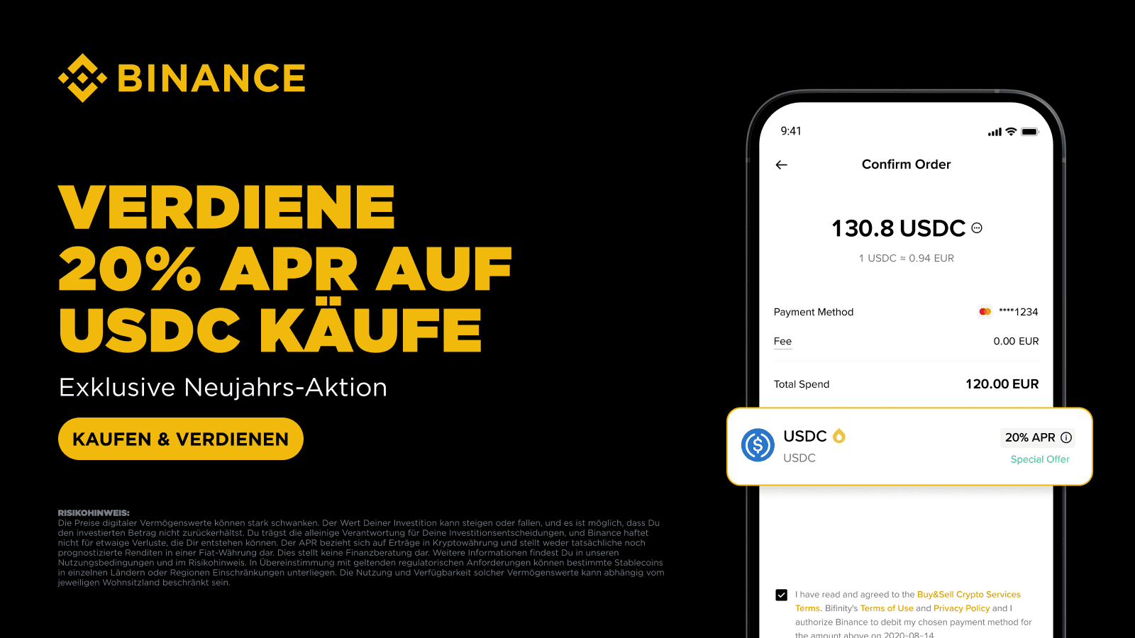 APR-Erträge werden aus eigenen Mitteln von Binance gezahlt und auf Grundlage einer Bewertung der jeweils aktuellen Marktbedingungen festgelegt. Diese Aktion steht in keiner Verbindung zum Emittenten von USDC.