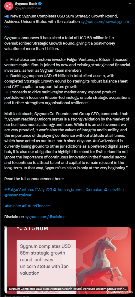 Swiss crypto-focused bank Sygnum has raised $58 million in a strategic growth round, achieving unicorn status with a valuation exceeding $1 billion.