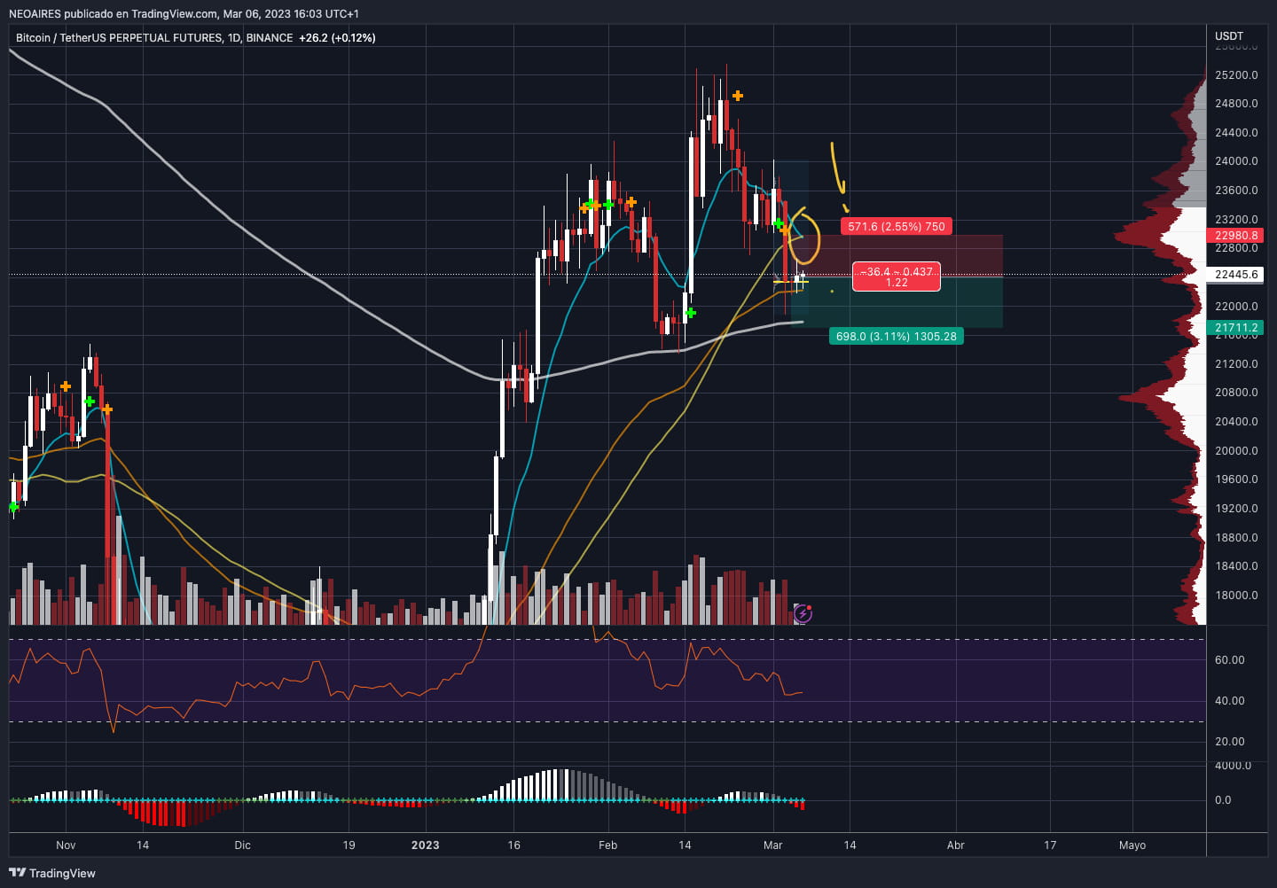 On March 4th, I opened a short position for BTC at a price of 22,342.00. With traditional markets open and no major movements or surprises, I'll keep the position open and wait for the price to visit the low liquidity zone, despite the daily graph showing a long-term increase.
