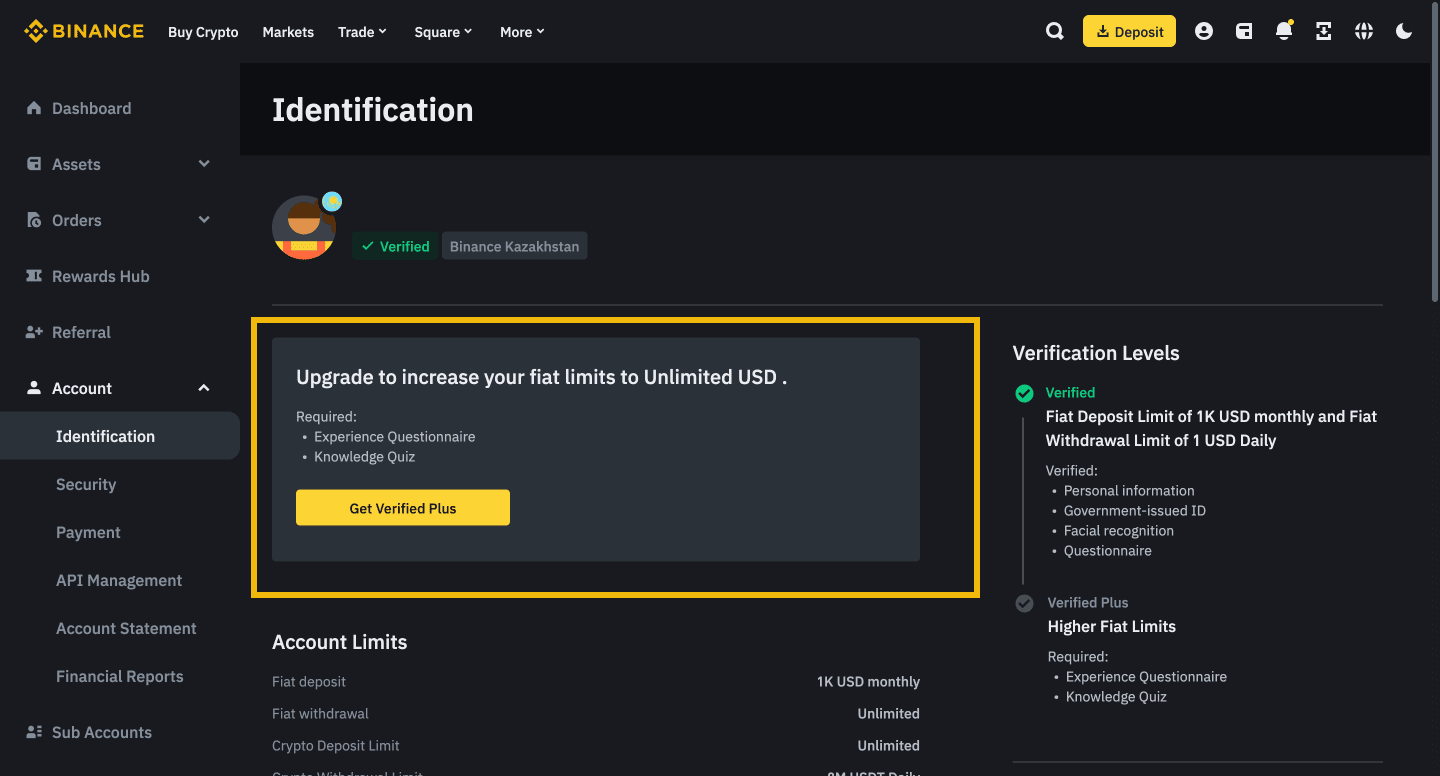 Log in to Your Binance Kazakhstan Account and head to verification section: