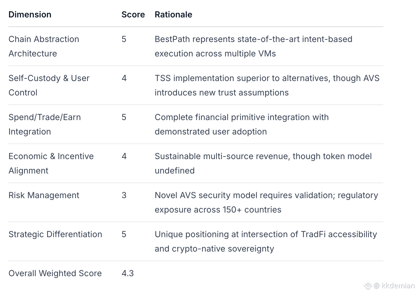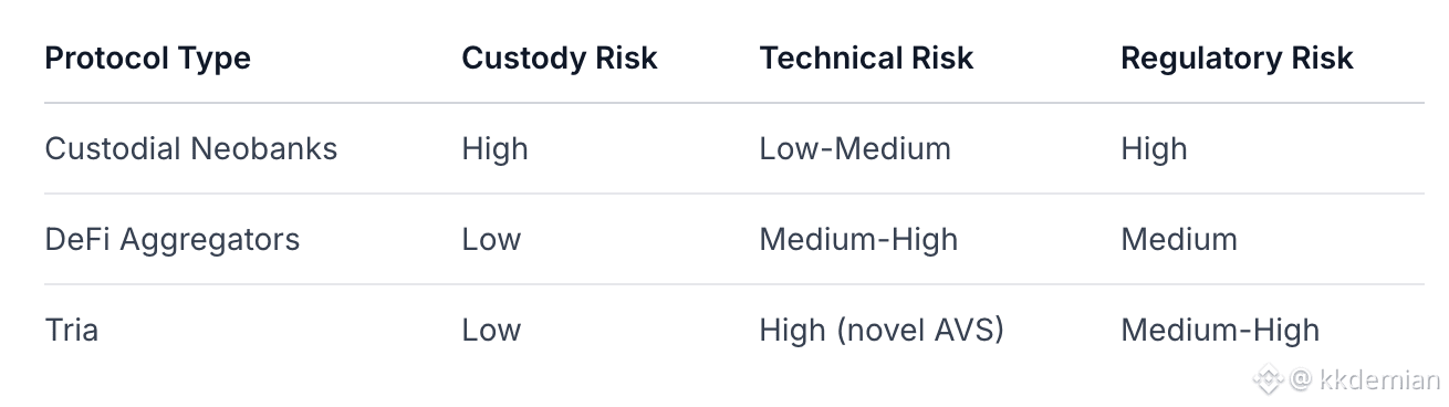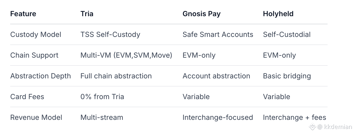Tria represents a paradigm shift in crypto UX through genuine chain abstraction, delivering a self-custodial neobank that processes $20M+ in volume with 300,000+ users in its first three months. Built on BestPath AVS—an EigenLayer-powered intent marketplace—Tria eliminates bridges, gas tokens, and chain-switching while maintaining full user custody via Threshold Signature Schemes. The protocol demonstrates exceptional early traction (13x faster growth than EtherFi's card) and sustainable revenue generation ($1.2M early revenue) through swap spreads, interchange fees, and yield products. While dependency on the unproven AVS model introduces execution risk, Tria's technical architecture, team pedigree, and market positioning warrant serious institutional consideration for both investment and integration opportunities.