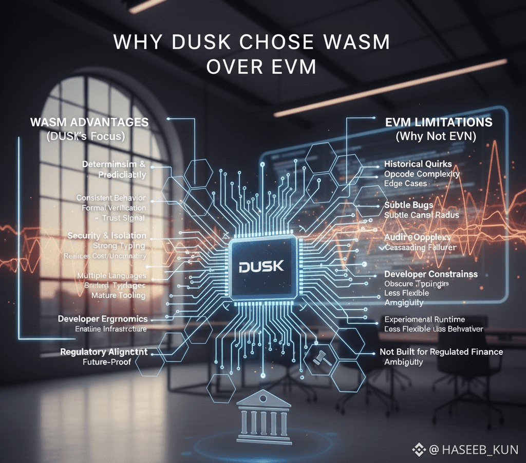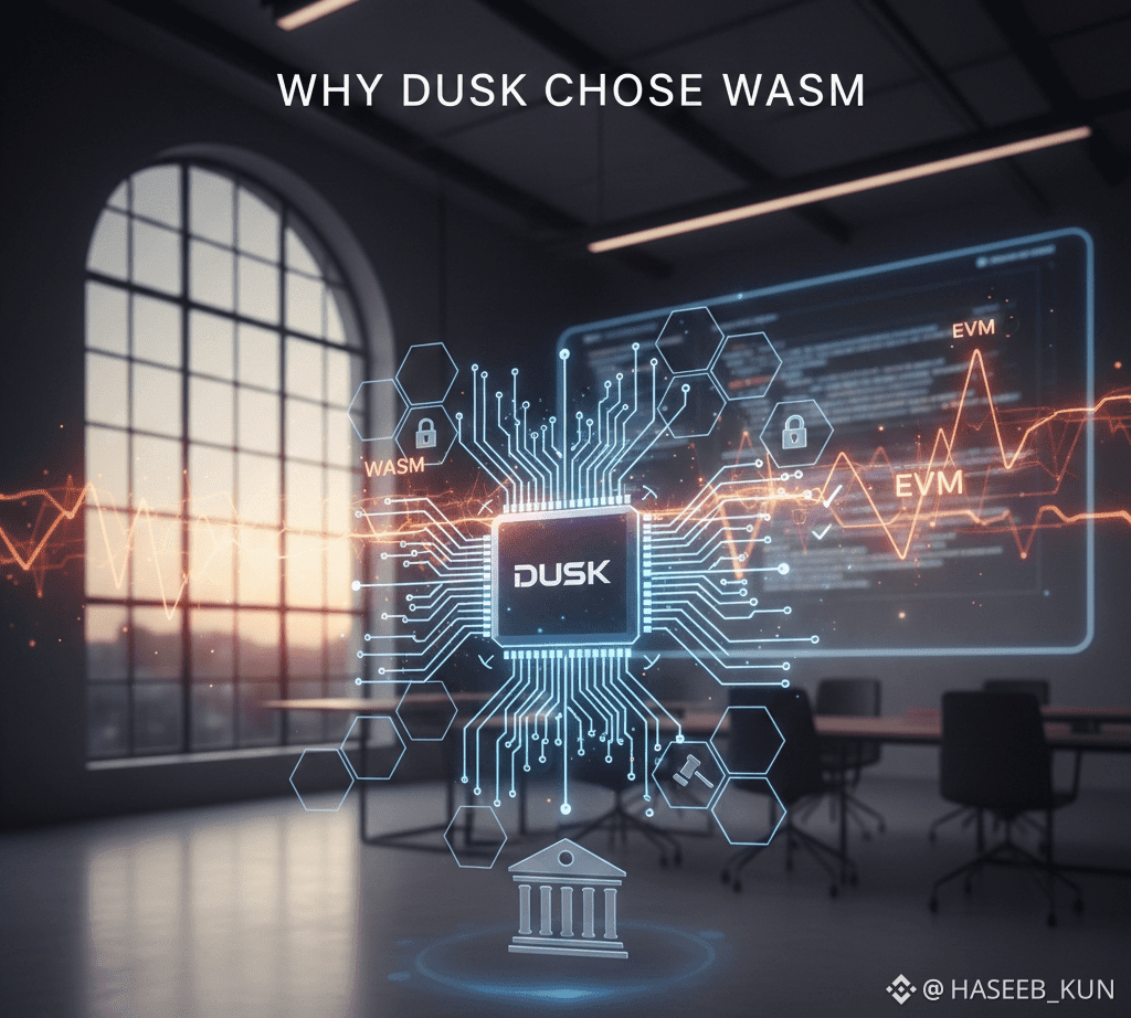 I still remember the moment when the choice finally clicked for me. I was comparing blockchains that claimed to be “ready for institutions,” and almost all of them leaned heavily on the EVM. Familiar. Proven. Comfortable. Yet something felt off. When you look closely at regulated finance—real securities, compliance rules, predictable settlement—you realize that familiarity alone isn’t enough. That’s when Dusk’s decision to build its core execution layer on WASM instead of EVM started to make deep, practical sense.