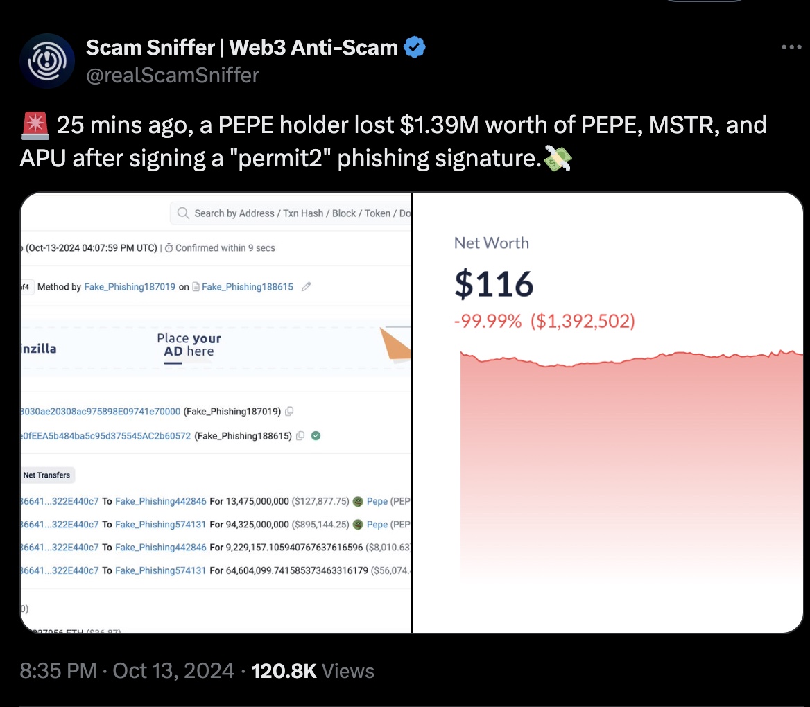 Earlier today, Scam Sniffer detected that a PEPE holder lost $1.39 million worth of PEPE, MSTR, and APU after signing a 'permit2' phishing signature. The report highlighted that Uniswap's introduction of Permit2 allows phishing signatures to approve multiple tokens simultaneously. Once the victim's signature is obtained, the attackers can transfer various assets.