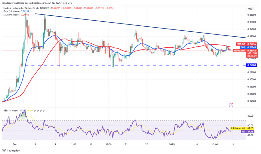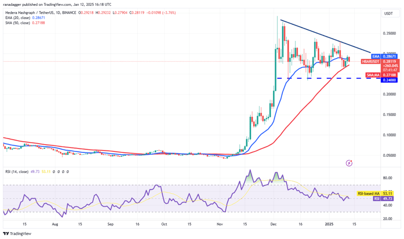 Hedera is testing the 50-day SMA at $0.27. A breakout above the downtrend line could push it to $0.38, but a dip below $0.24 would signal bearish trouble.