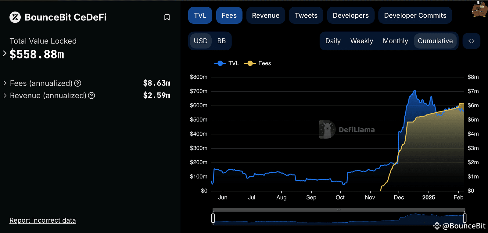 BounceBit's trajectory in 2024 demonstrated the power of organic growth in CeDeFi. While our TVL touched $1 billion early in the year during our pre-TGE phase, the true validation of our model came in Q4. Following the November launch of CeDeFi V2, our TVL surged organically from $200 million to over $700 million—a remarkable 3x growth achieved without any token emissions or points programs. This growth translated directly to protocol fees, with November and December setting consecutive records of $2.5 million and $3 million respectively, demonstrating the sustainable economics of our model.