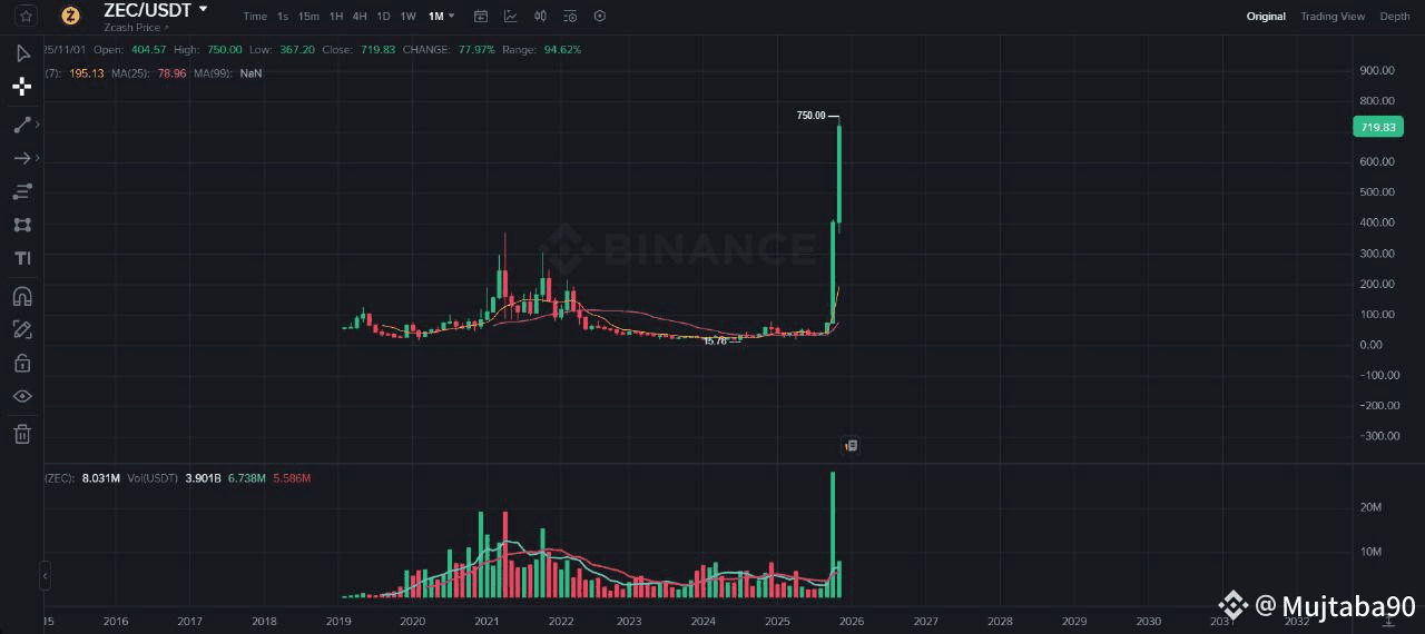 Zcash ($ZEC) has just delivered a massive breakout, soaring over 35% in a single session and hitting $750, marking one of its strongest monthly performances in years! ๐