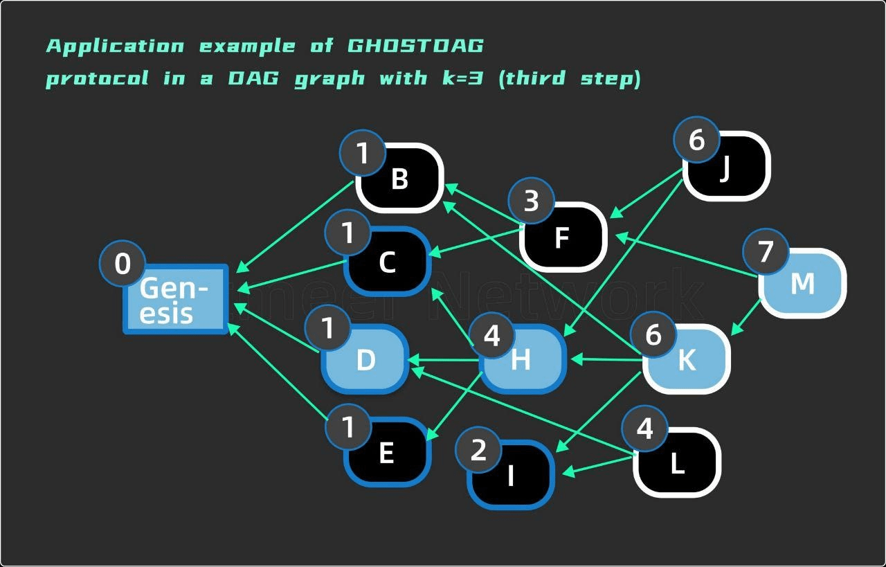 The breakthrough comes through the GHOSTDAG protocol, which mathematically solves the ordering problem that emerges when multiple blocks exist simultaneously. Instead of discarding competing blocks, GHOSTDAG creates a coherent linear ordering by identifying the largest k-cluster of well-connected blocks (colored "blue" for honest work) and relegating outliers and potentially malicious blocks to a "red" set that gets ordered after their referencing blue blocks.