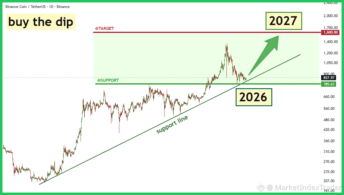 Looking at the 1D chart, $BNB has pulled back perfectly to the confluence of two major support levels. The long-term rising support trendline has been tested, coinciding with the crucial horizontal support zone between $785 and $830. The current price action (around $857) suggests strong demand is entering the market here. Holding this zone is absolutely key for the continuation of the macro uptrend. Our primary long-term target, based on structural expansion, remains the $1,600 level.
