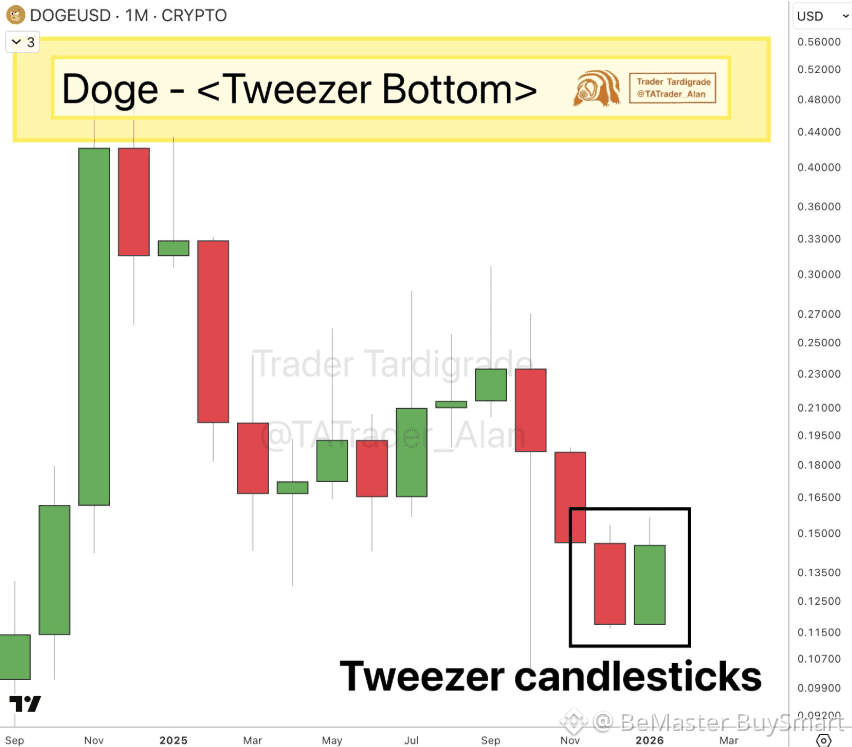 ๐ Dogecoin just printed an important technical signal on its monthly chart that's getting traders excited after a sharp early-month bounce. DOGE/USD has formed a pair of Tweezer candlesticks on the monthly timeframe. This pattern shows up when two consecutive candles share nearly identical lows, typically signaling that selling pressure is running out of steam and a trend reversal might be starting after a decline.