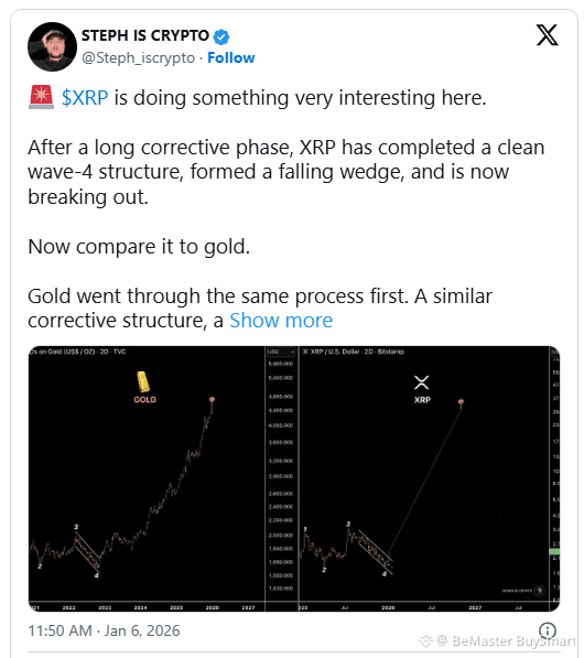 The comparison focuses on wave structure, corrective behavior, and breakout dynamics rather than short-term price noise. The chart shows XRP emerging from a long corrective phase that closely resembles the prior consolidation of Gold. Gold resolved its structure first, and XRP appears to be following with a delay.