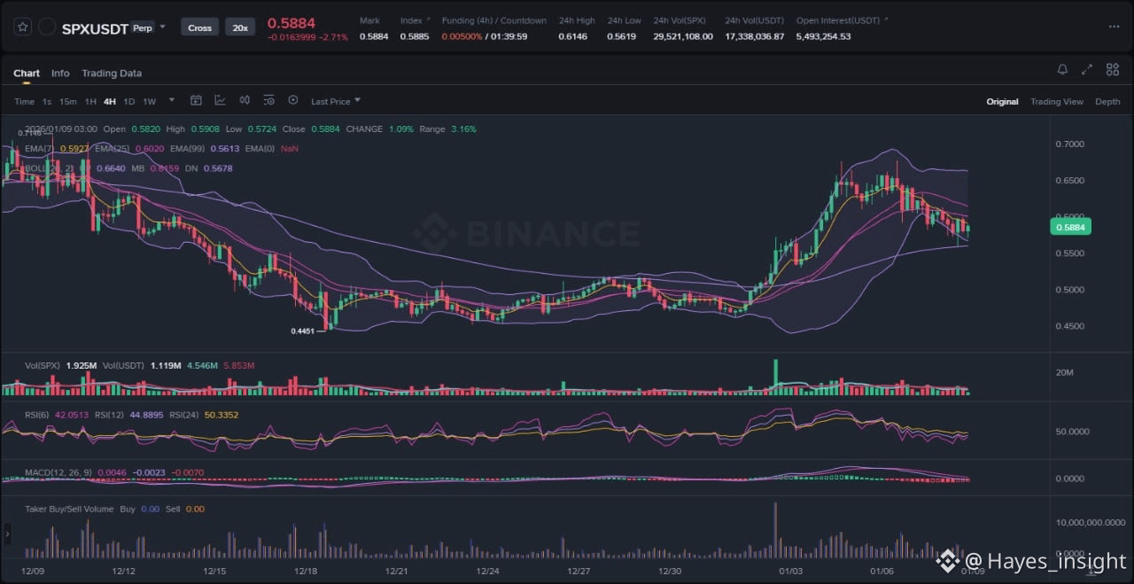 Examining the attached SPX chart on a 4-hour timeframe reveals a clear uptrend structure, with price action demonstrating impulsive moves higher since mid-December 2025. The candlestick patterns show a series of higher highs and higher lows, confirming bullish continuation rather than a range-bound consolidation. Notably, the price has broken out from a descending channel formed in late November, rejecting lower levels around 0.15 as local swing lows. Volatility has expanded, as seen in the widening Bollinger Bands, with the middle band (20-period SMA) sloping upward, supporting the trend's strength. The 7-period EMA is positioned above the 25-period EMA, and both are well above the 99-period EMA, indicating sustained upward momentum without immediate signs of mean reversion. At the current price of 0.2029, the chart displays a consolidation phase near the upper Bollinger Band, following an impulsive rally that pushed from 0.18 to 0.21 in a single session. This rejection of the 0.18 support level, coinciding with a liquidity pocket, has prevented a deeper pullback, while local swing highs at 0.22 act as near-term resistance.