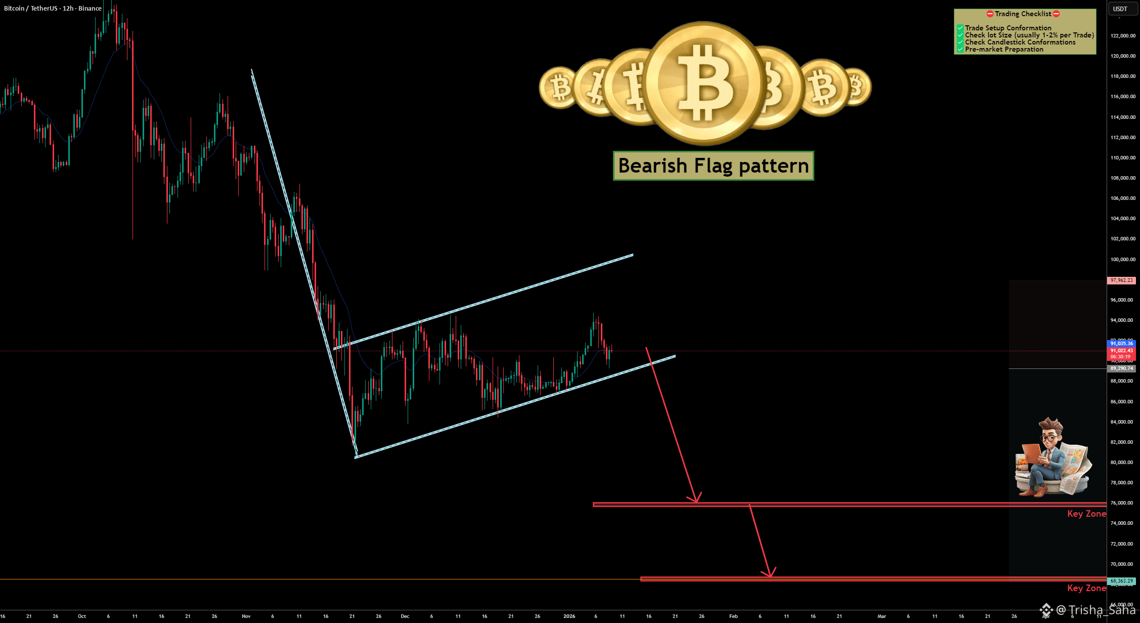 Bitcoin is currently forming a classic Bearish Flag pattern on the higher timeframe after a strong impulsive sell-off. This structure often signals trend continuation, and price action is now approaching a critical decision zone.
