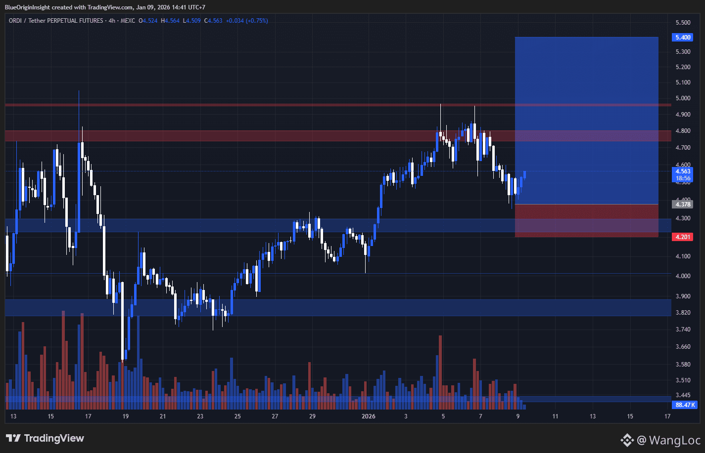 After a strong impulsive move, $ORDI reacted at the 4.8–5.0 supply zone and is now pulling back toward 4.3–4.4, a key H4 demand area.