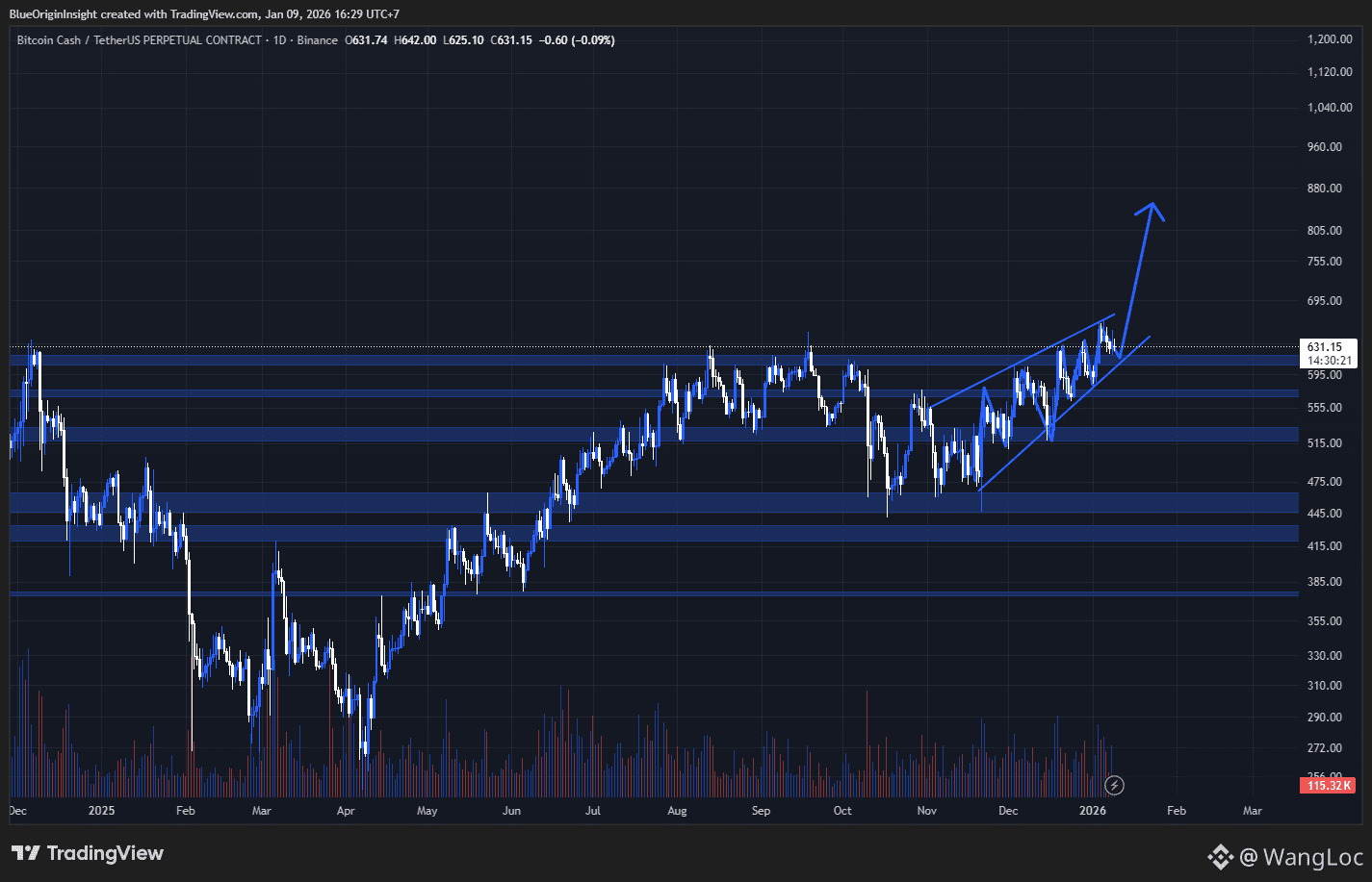 $BCH is quietly building one of the cleanest bullish setups in the market. Price remains in a clear uptrend while the Ascending Triangle has already been completed, with the $610–$650 zone standing as the final resistance before expansion.