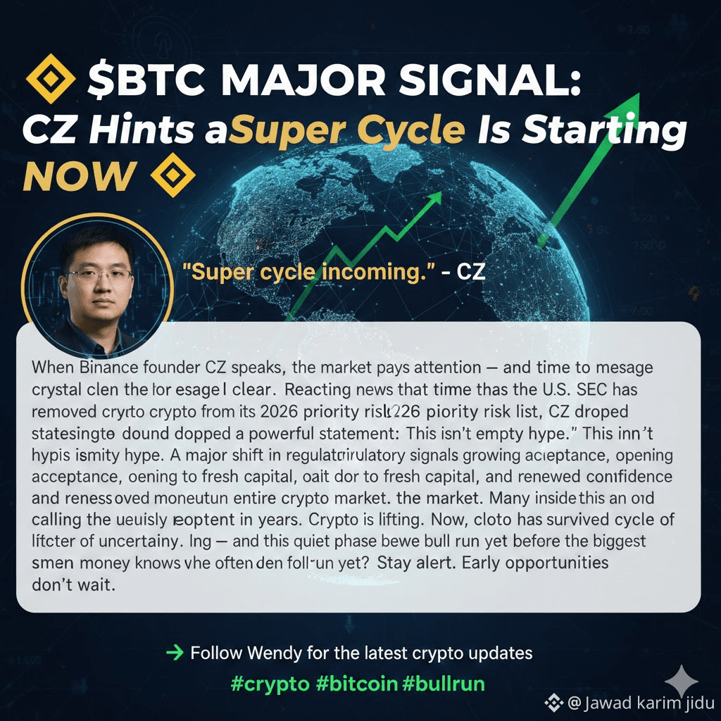 When Binance founder CZ speaks, the market pays attention — and this time, the message is crystal clear. Reacting to breaking news that the U.S. SEC has officially removed crypto from its 2026 priority risk list, CZ dropped a powerful statement: