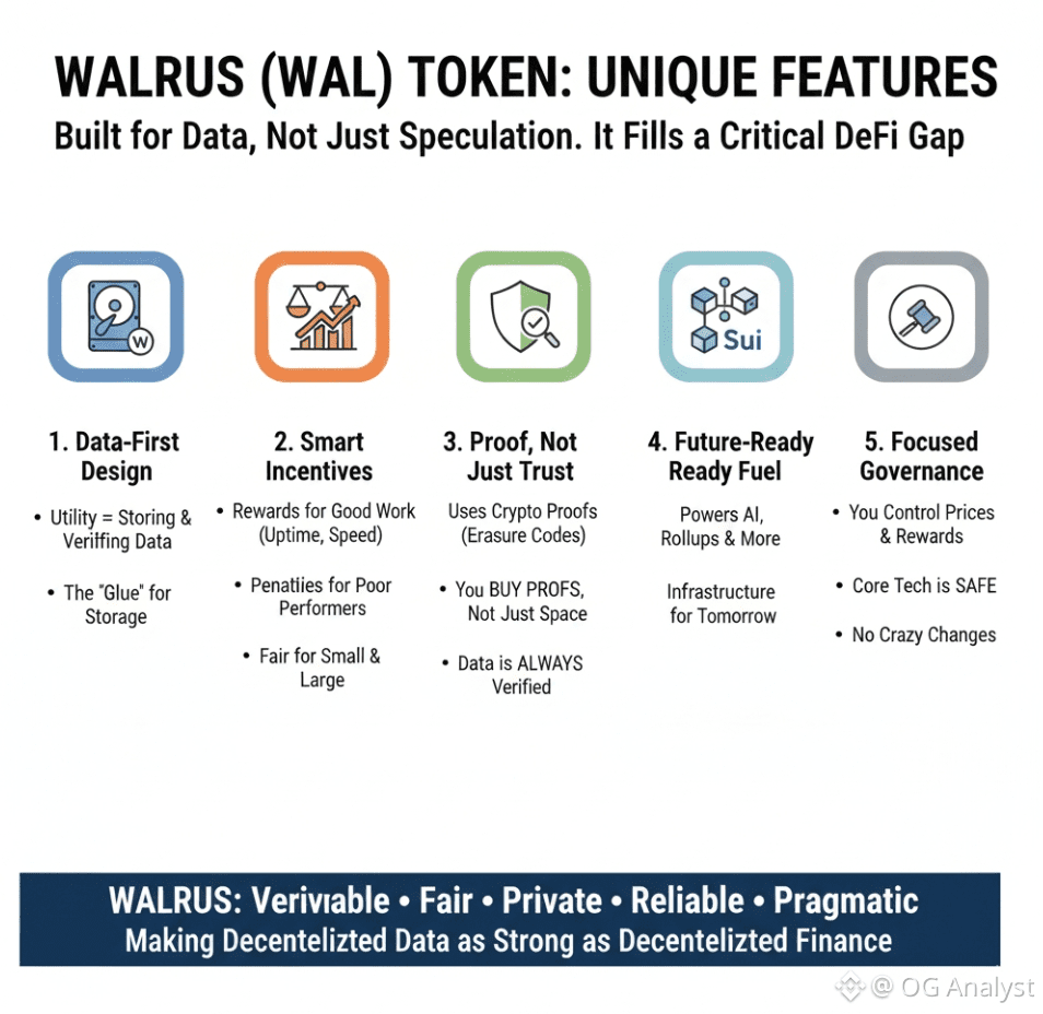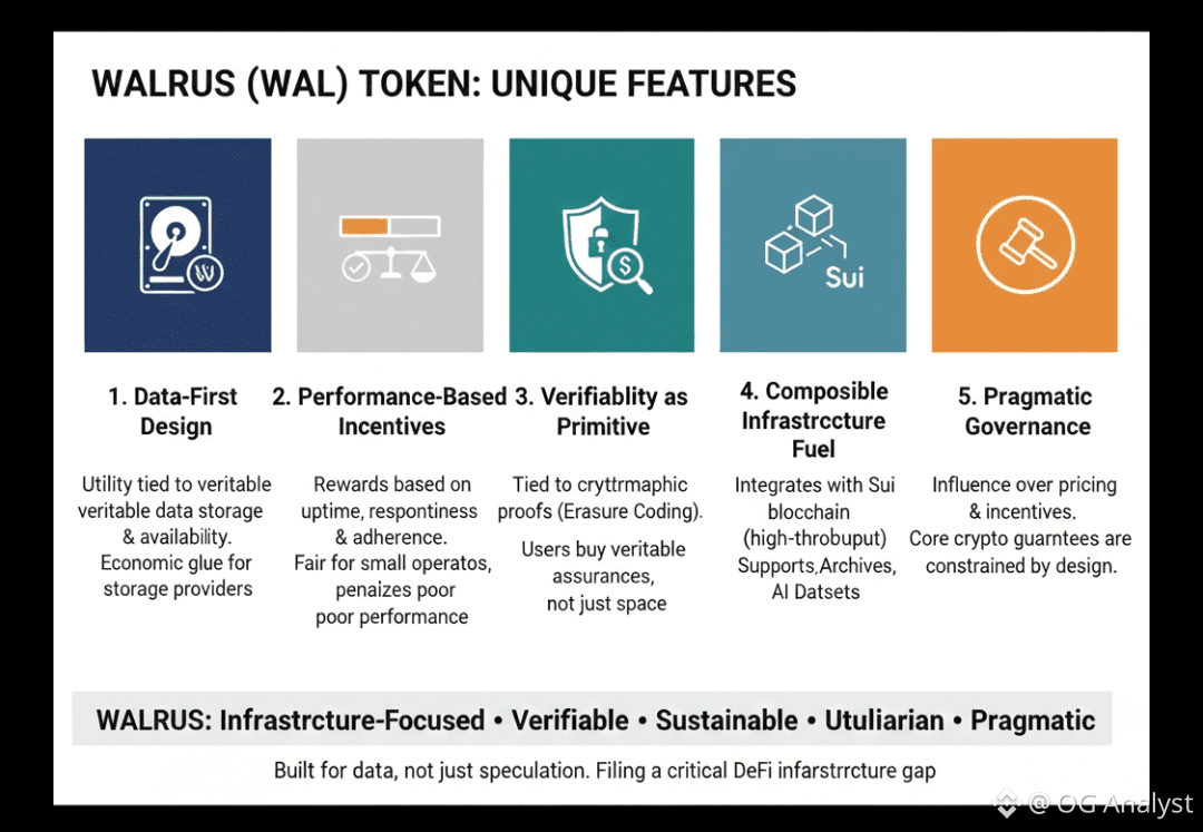 The Walrus (WAL) token stands out not through novelty, but through discipline. By anchoring its utility to verifiable data storage, aligning incentives with performance rather than power, and limiting governance to practical levers, WAL fills a gap that many cryptocurrencies overlook. It shows what a token can look like when it is built for infrastructure first—and speculation second.