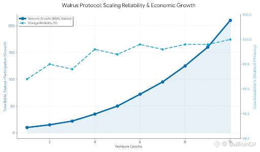 Asynchronous challenge protocols ensure constant correctness. Tests are randomly made of whether nodes possess correct slivers. The failures lead to less epoch rewards or dropping of staked $WAL, to have reliable nodes during the storage period. Sui epoch transitions reassign committees, according to stake and performance, without disrupting availability.