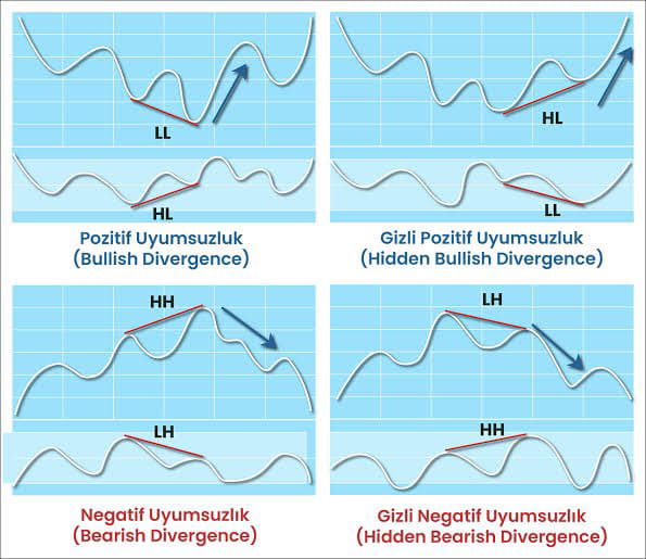 Positive divergence works better at indicator bottoms, while negative discordance works better at indicator tops. Hidden incompatibilities generally work better in the middle of the indicator. Compatibility study can be done with various indicators: macd, rsi, bb etc.