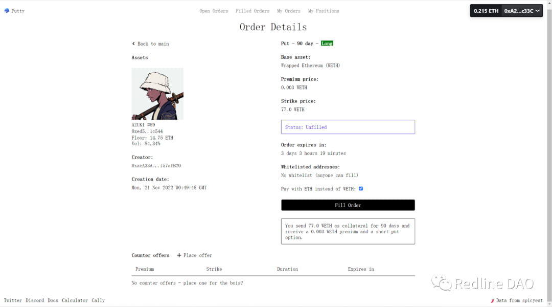 The NFT collection floor price is obtained through Spicyest's data, and players set parameters such as strike price/premium/expiration date by themselves. The product has an options calculator as a guide, but it is still relatively complicated for options novices.