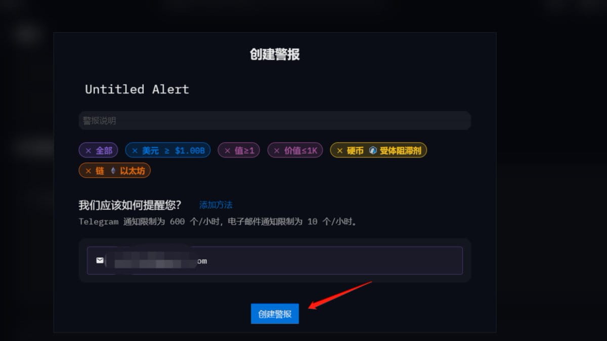 3) Fill in the wallet address, token, quantity chain, etc. that need to be monitored according to your own needs. Then enter your receiving email at the bottom and click Create to complete.
