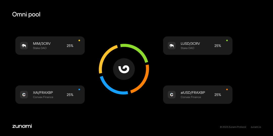 Zunami offers the Omni pool, a decentralized location where users can deposit USDT, USDC, and DAI. These funds are then allocated to multiple strategies, ranging from 2 to 10 strategies at a time. The selection and rebalancing of these strategies is determined by DAO voting.