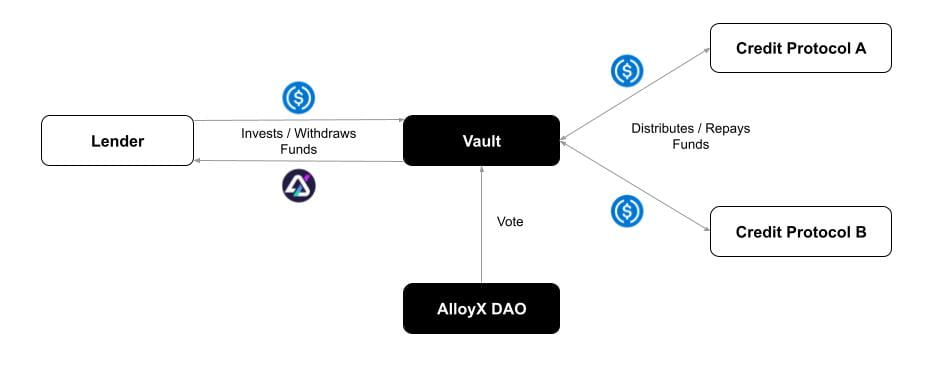 AlloyX’s vaults combine Credix Finance’s overcollateralized tokenized credit (digital tokens backed by real-world assets such as loans or debt instruments) with smart contracts for tokenized U.S. Treasuries to provide DeFi investors with access to real-world asset liquidity. Vaults on AlloyX follow a simple yet powerful principle: lenders provide funding in the form of USDC to the vault, which aggregates the assets deposited into the tokens, which are allocated and run according to the vault’s preset parameters. By depositing USDC, users receive vault tokens based on a floating exchange rate and earn yield. What makes AlloyX different is its automated allocation across multiple credit protocols, where USDC is deployed according to the vault’s allocation rules.