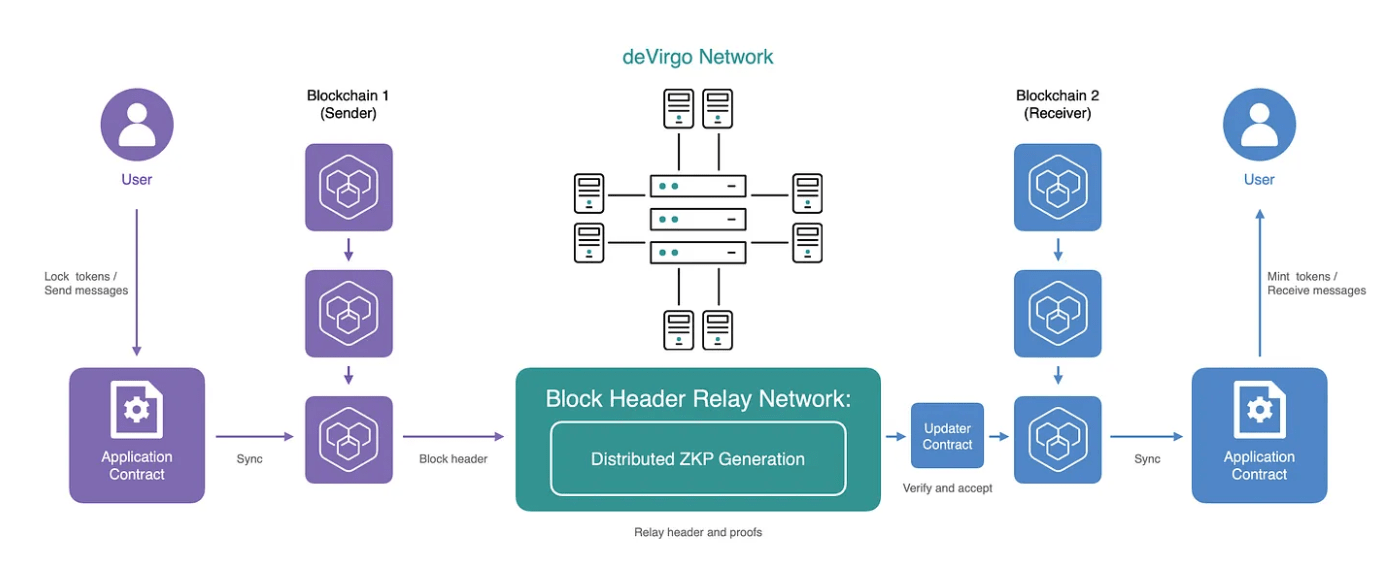 A key advance in this construction lies in the parallel use of zk-SNARKs: the Virgo prover (deVirgo), which introduces a novel distributed proof system to speed up the proof generation process and uses recursive proofs to reduce the cost of on-chain proof verification. deVirgo relies on the GKR protocol and a polynomial commitment scheme to generate proofs for circuits that verify multiple signatures. The deVirgo proofs are then compressed through a Groth16 prover and verified by an update contract on the target blockchain. The combination of these proof systems enables zkBridge to achieve efficient cross-chain communication without relying on external trust assumptions.