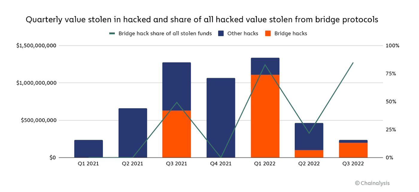Cross-chain bridges can be tricky. Ensuring the security of their cross-chain bridges is a major challenge because assets stored in smart contracts or central custodians need to be protected. Bridges have always been targets for hackers because of their centralized storage of funds. The evolving design of bridges also makes it possible for attackers to find new vulnerabilities and exploits. In 2022, Wormhole was hacked after a security fix was uploaded to Github, resulting in a loss of $325 million. The hackers took the funds away after the success. Chainalysis reported that cross-chain bridge attacks accounted for 69% of the total stolen funds in 2022.