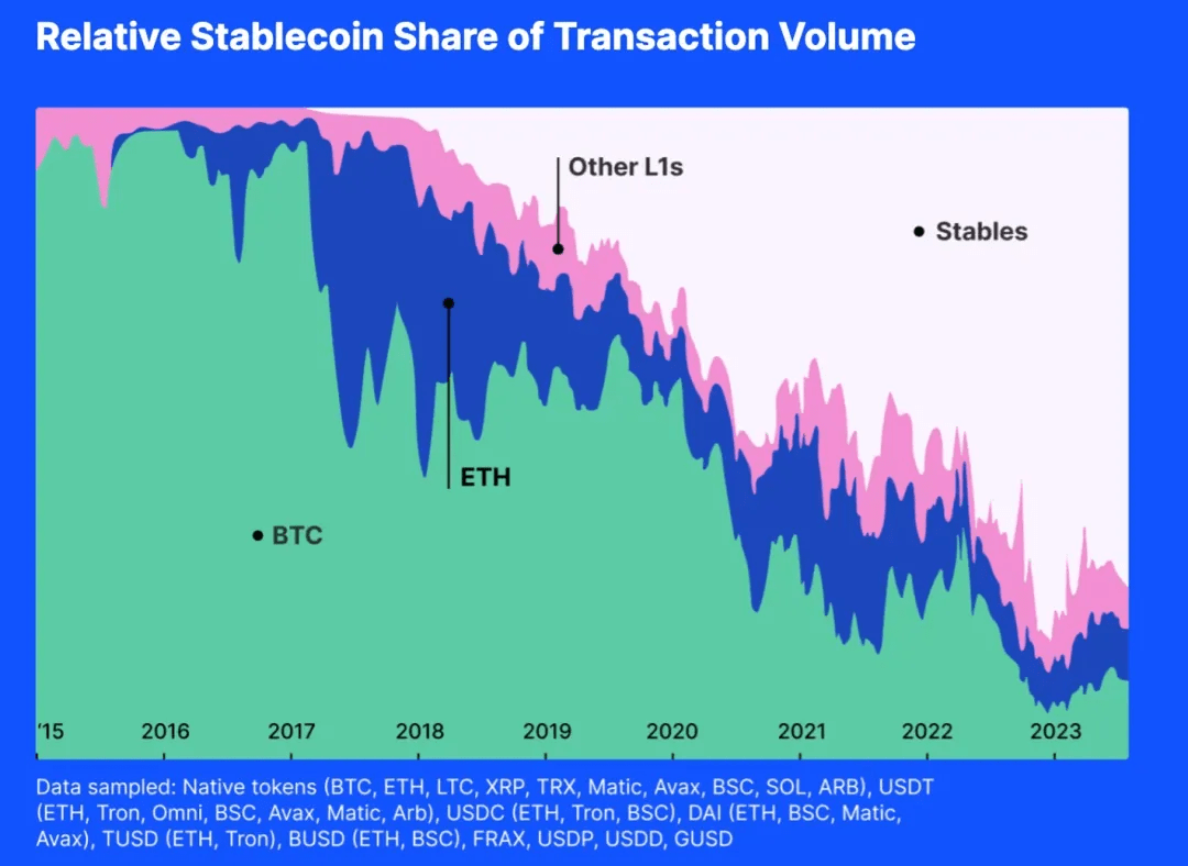 The above chart shows the activity of various cryptocurrencies. If we look at the proportion of transactions, we can see that in the past one or two years, most transactions are in USD stablecoins. If the market value of USD stablecoins cannot be expanded, as new coins continue to be issued, the liquidity pool will be drained.