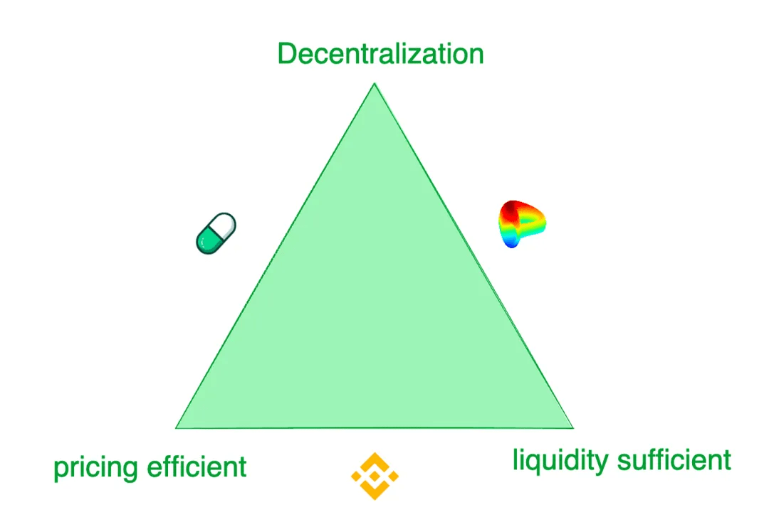 To summarize, contemporary token exchanges face a trilemma: 1) sufficient liquidity, 2) effective pricing, and 3) decentralization.