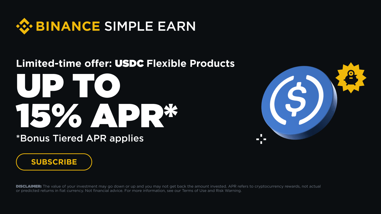 Binance Earn is pleased to announce a promotion for USDC Simple Earn Flexible Products! During the Promotion Period, users who subscribe to USDC Simple Earn Products may enjoy up to 15% APR* in total, which includes exclusive Bonus Tiered APRs in addition to Real-Time APR rewards.
