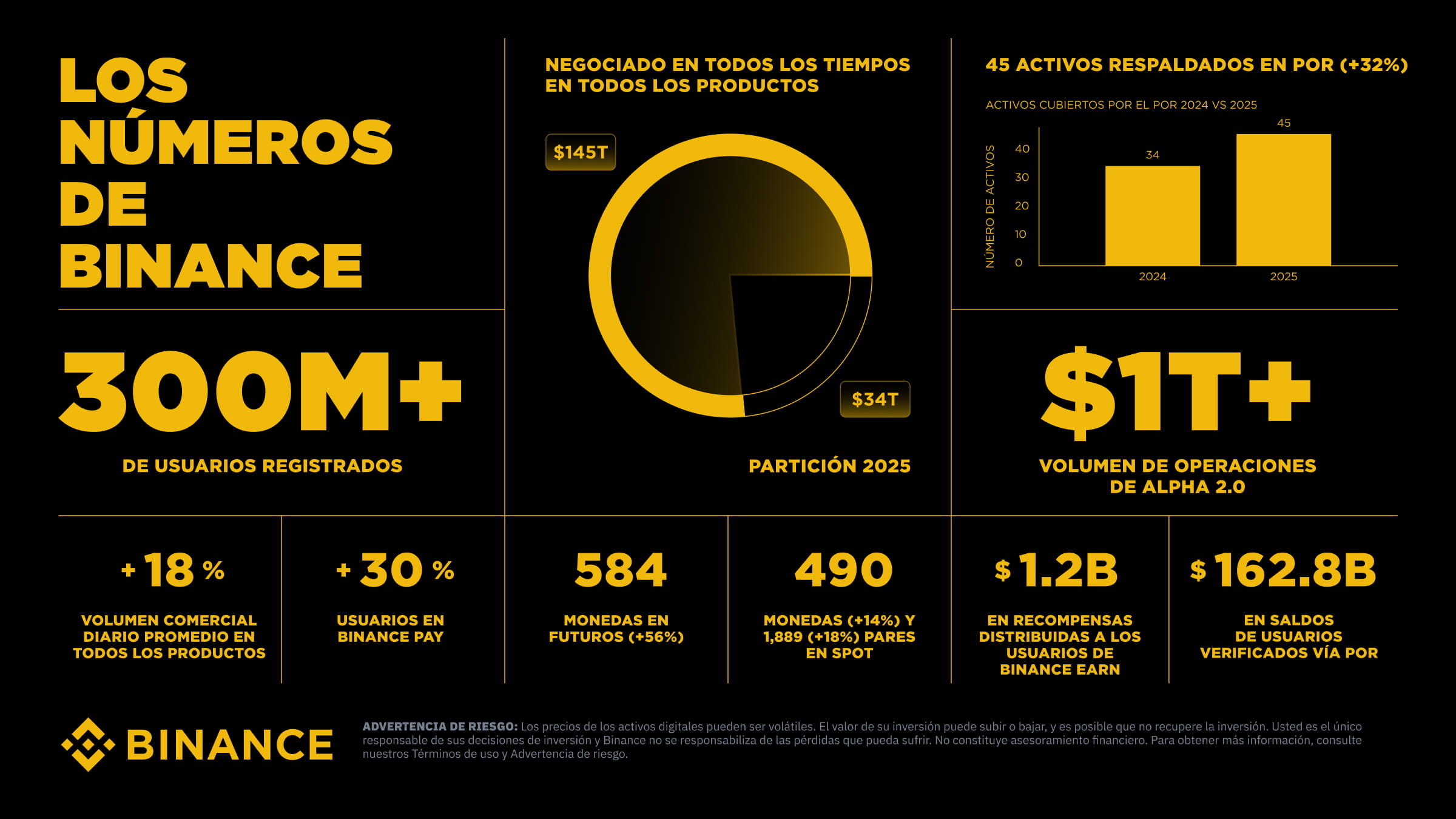 • Binance mantuvo su posición como principal plataforma de liquidez cripto global, con más de 34 billones de USD negociados en 2025 y volumen spot superior a 7,1 billones de USD, junto con un aumento del 18% en el volumen diario promedio de trading en todos los productos.