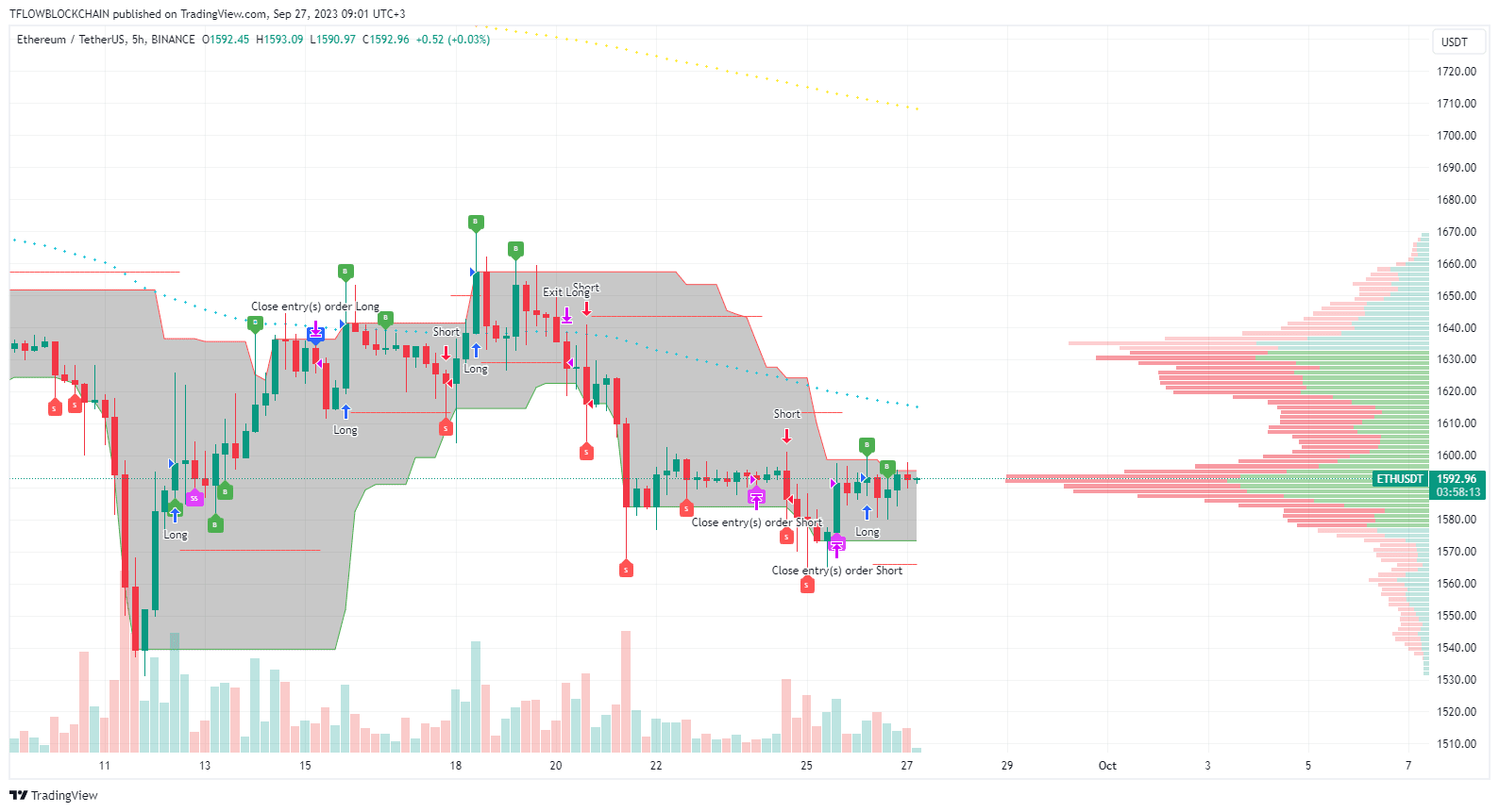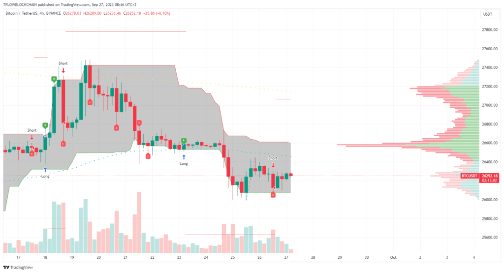 Bienvenidos a todos al Market Monitor de hoy del 27 de septiembre de 2023. Juntos administramos una cartera de 10 criptomonedas y operamos en vivo en la plataforma Binance Futures. Utilizamos el motor de operaciones TFLOW en el gráfico 4H. La capitalización total del mercado es de 1,05 billones de dólares, el volumen diario es de 22,6 mil millones de dólares, el dominio de BTC es del 49% y el índice de miedo y codicia es de 44.