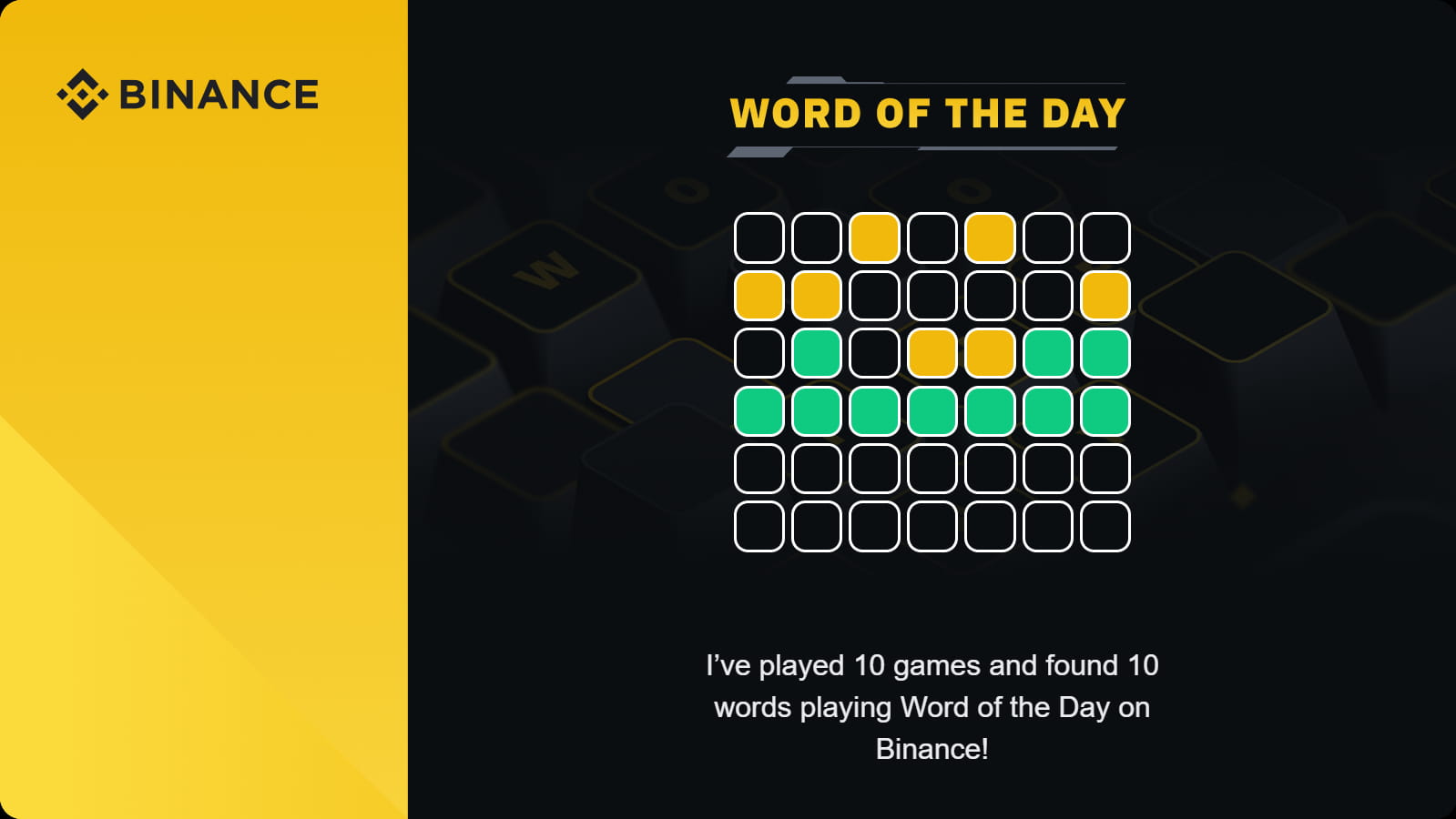 ¡Juego de palabra del día (WOTD)! Todos los usuarios elegibles compartirán equitativamente un grupo de 500,000 puntos Binance, que pueden usarse para canjear recompensas en Rewards Hub.
